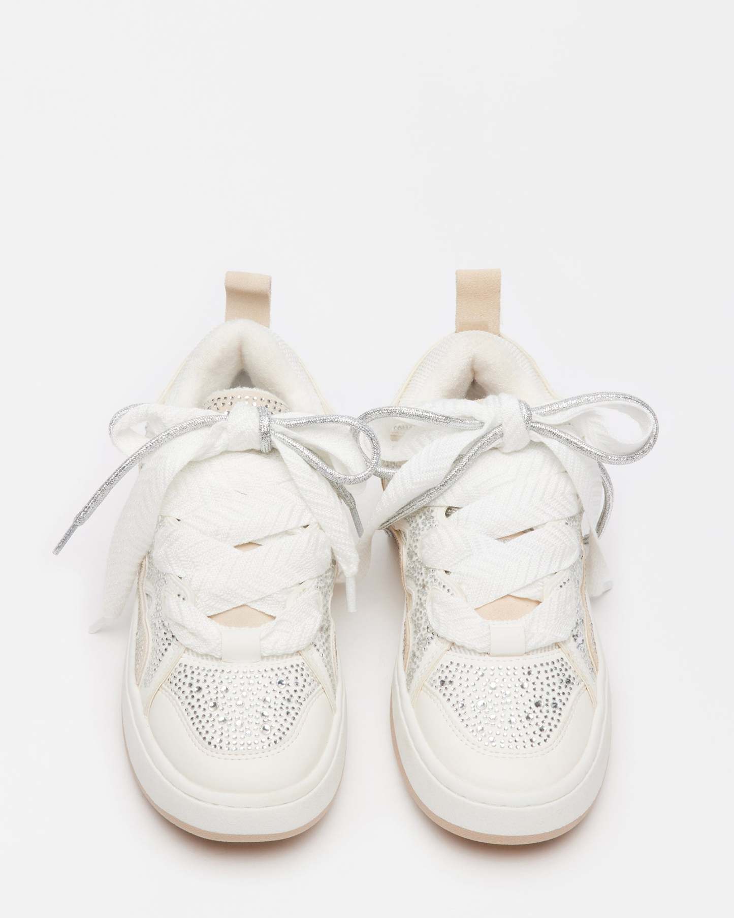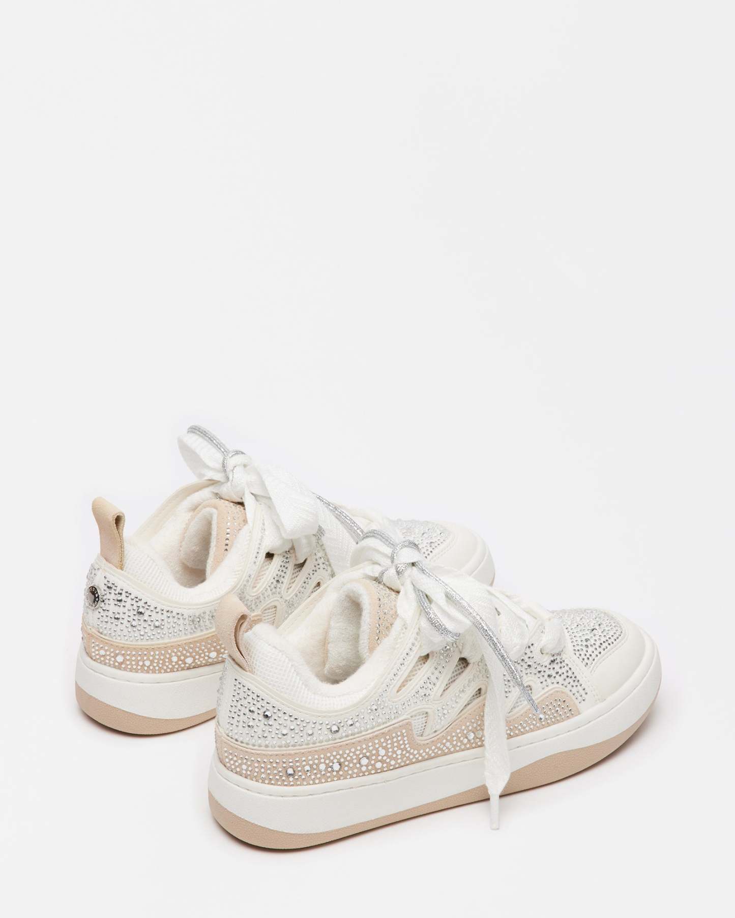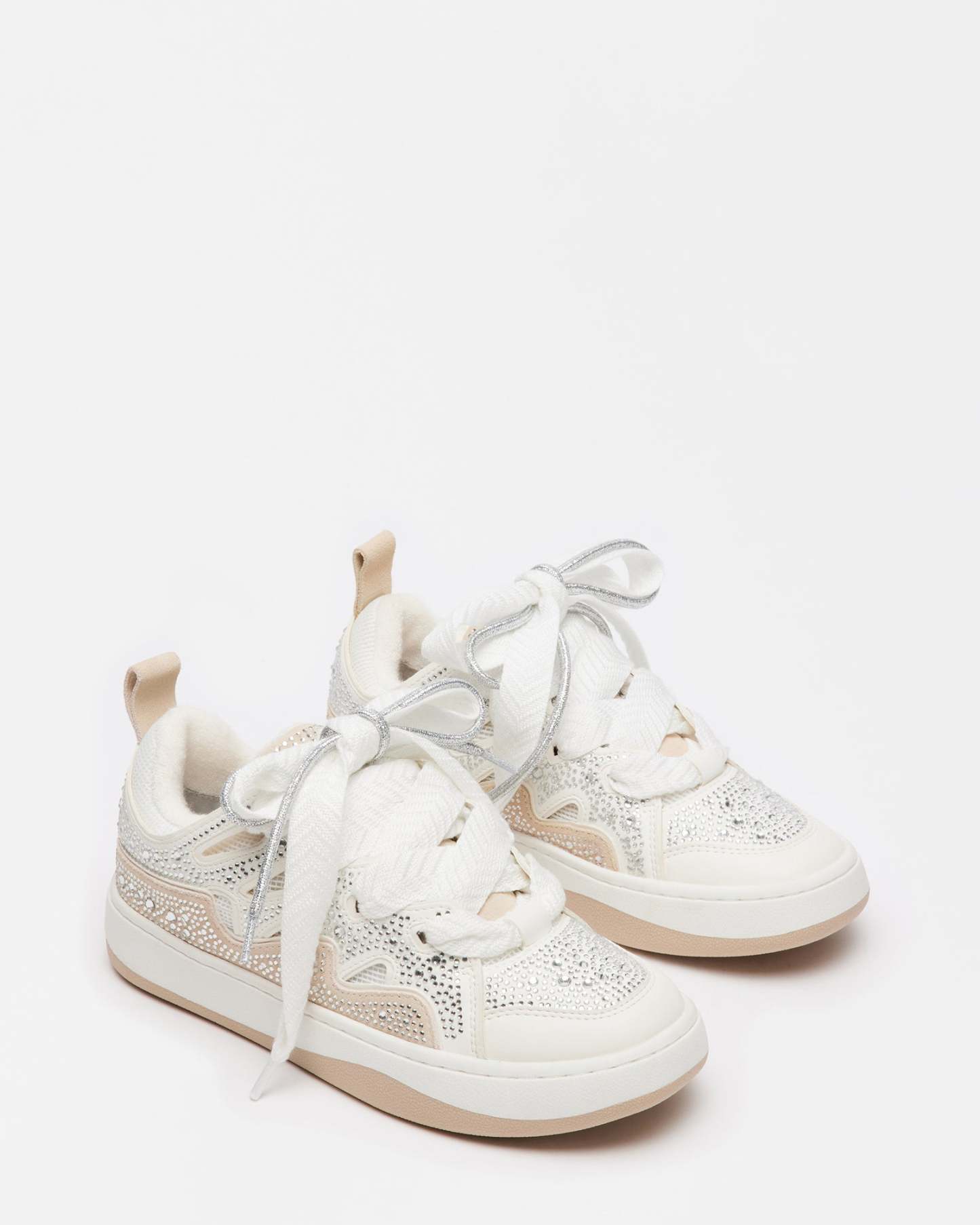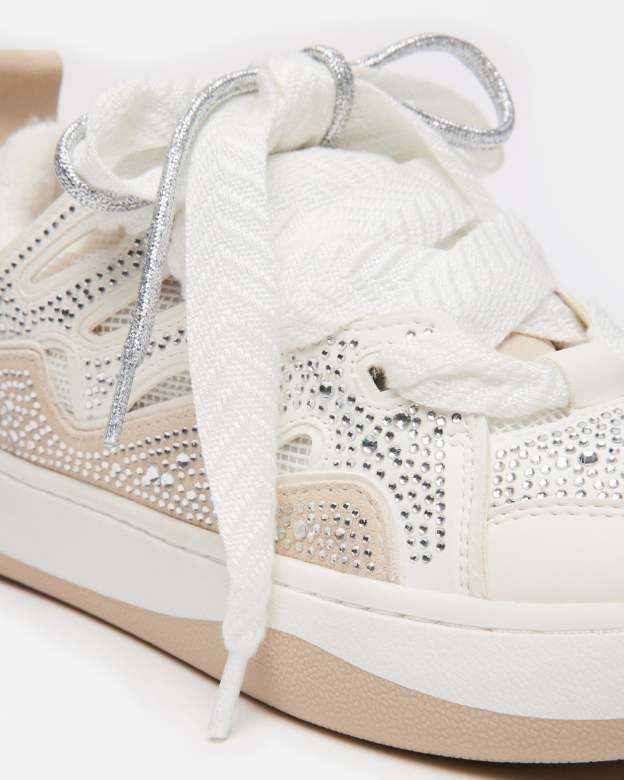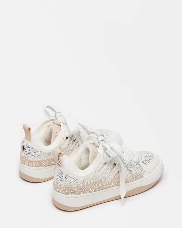 Layered texture gives the ROARING White Rhinestones platform sneakers their signature look, with a wider set of laces crossed over the first set using cutout panels along the sides of the shoe. Rhinestone embellishment finishes the design with a touch of sparkle.