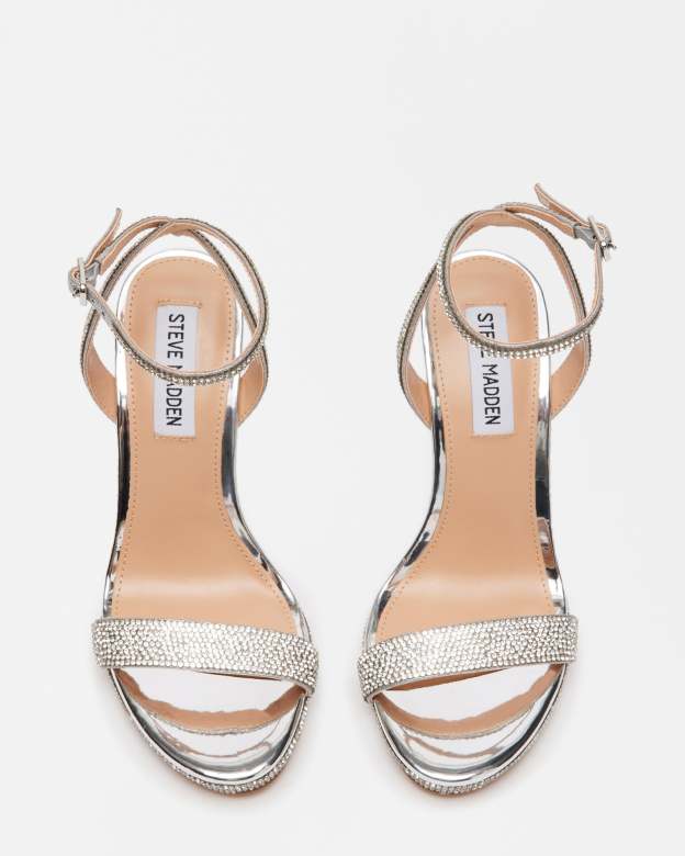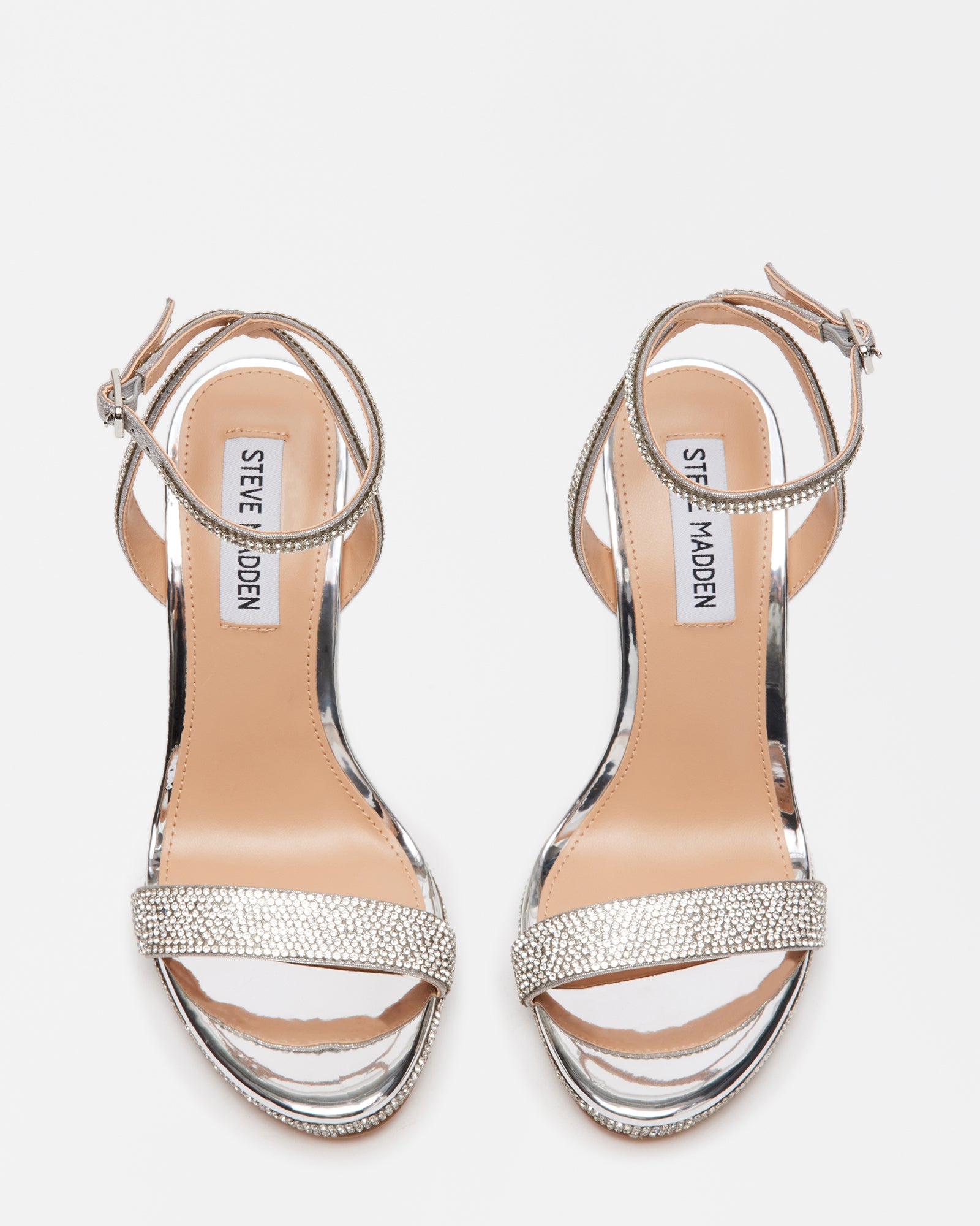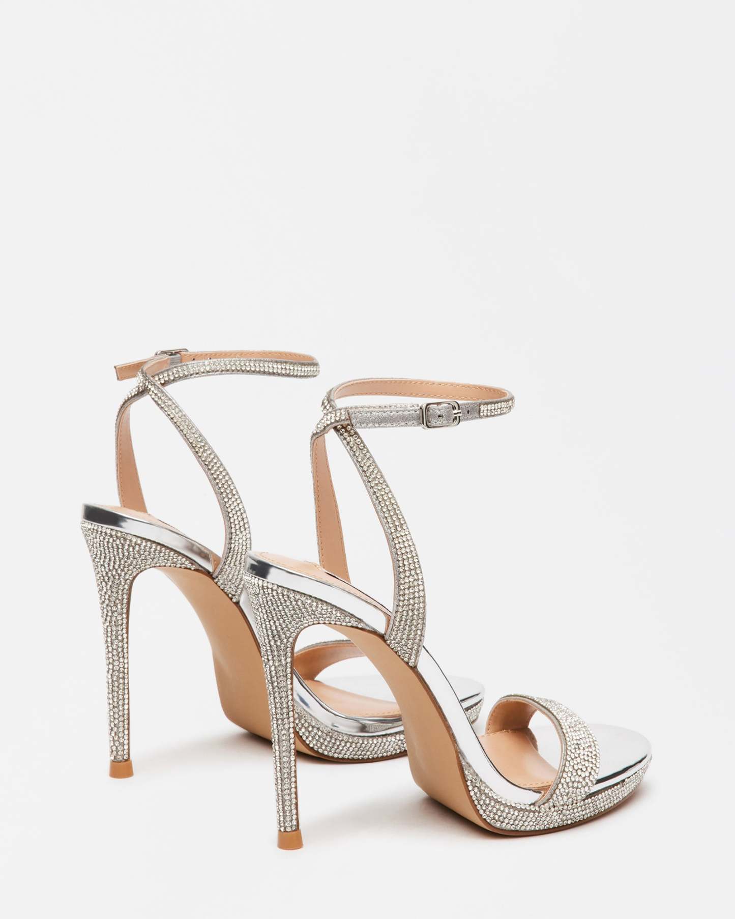 is encrusted with sparkling rhinestones from the minimalist straps to the front platform and stiletto
