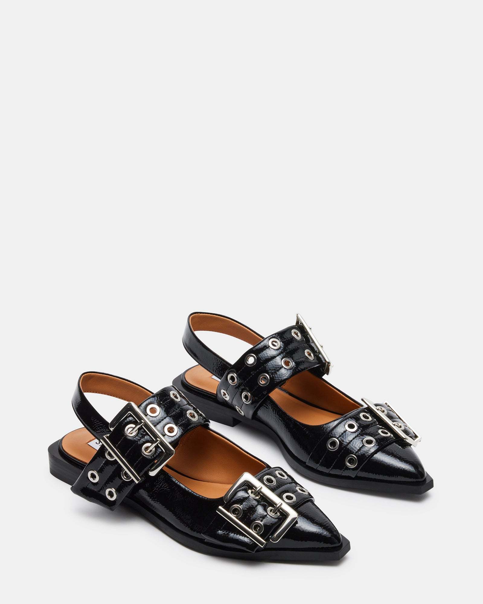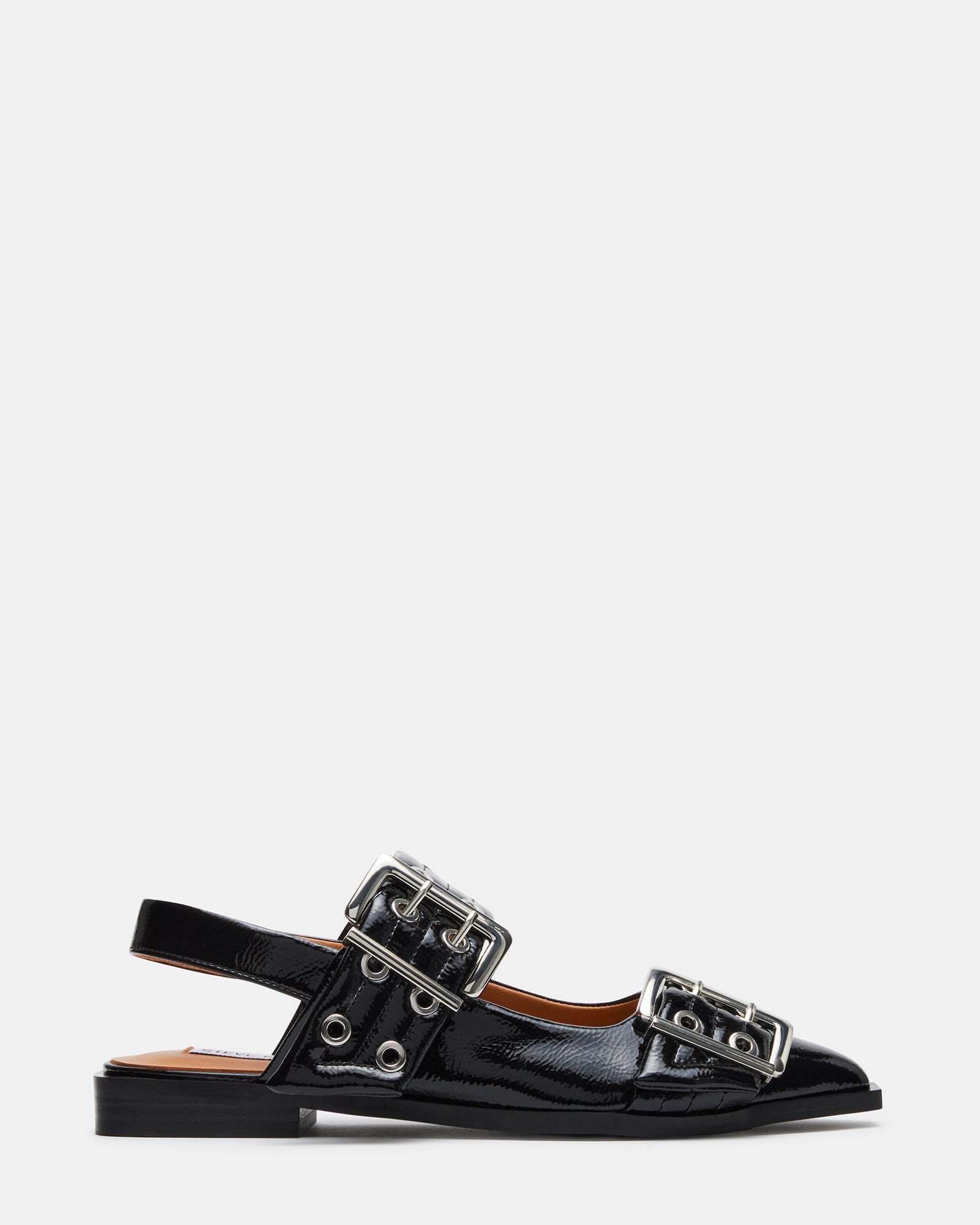 The GRAYA slingback flats have an angular silhouette with a square back and a snipped toe. Chunky grommets and oversized buckles give an edge to the wide straps over the top and the toe of this design.