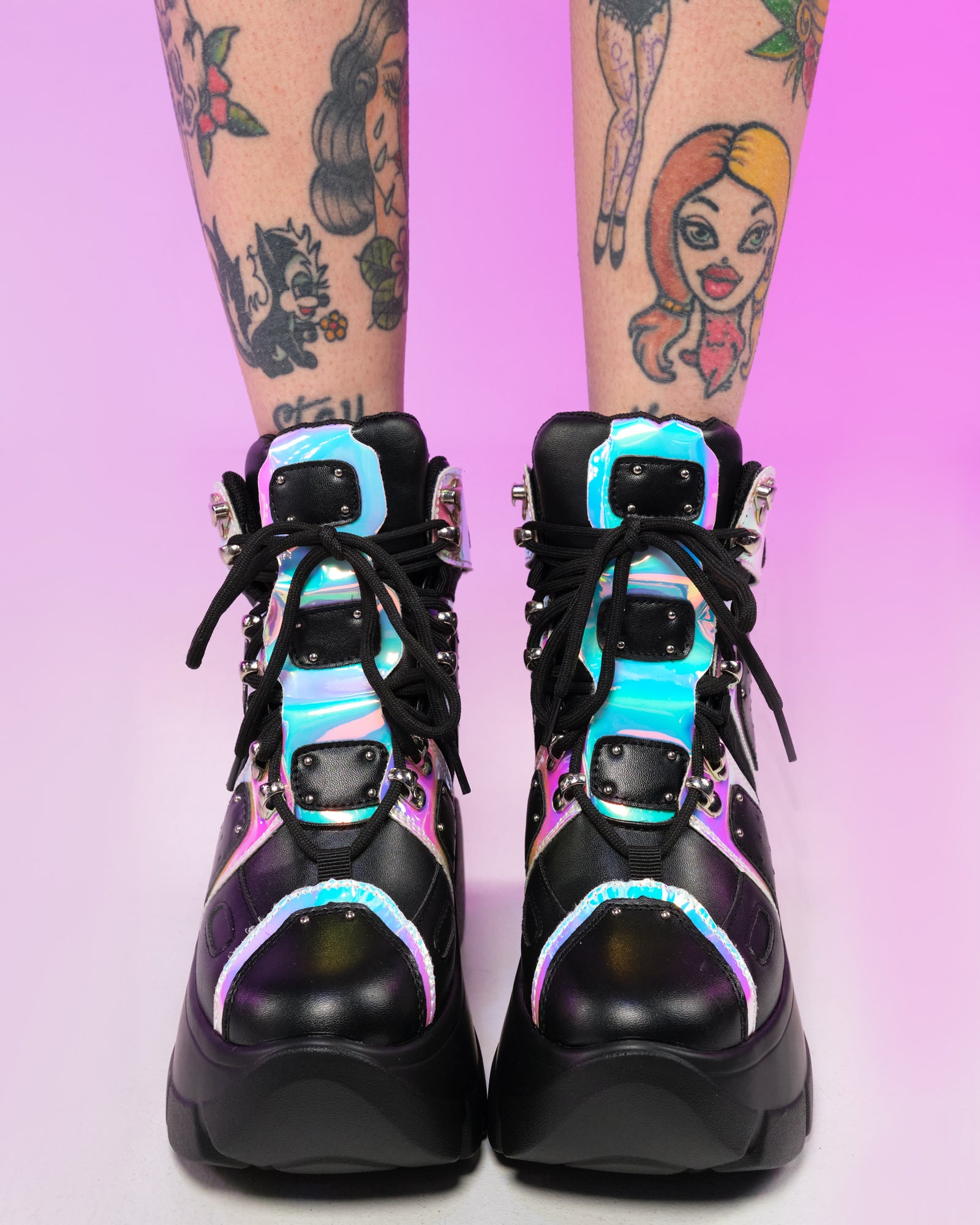 Features iridescent holographic panels. adjustable lace-ups & plate detailing. hidden wedge platforms. and padded collars and tongues.