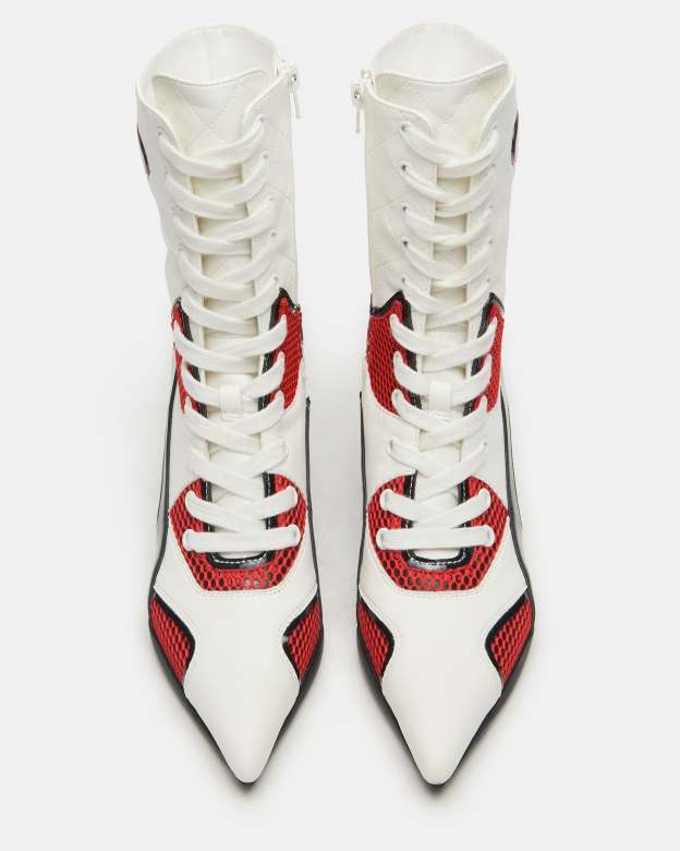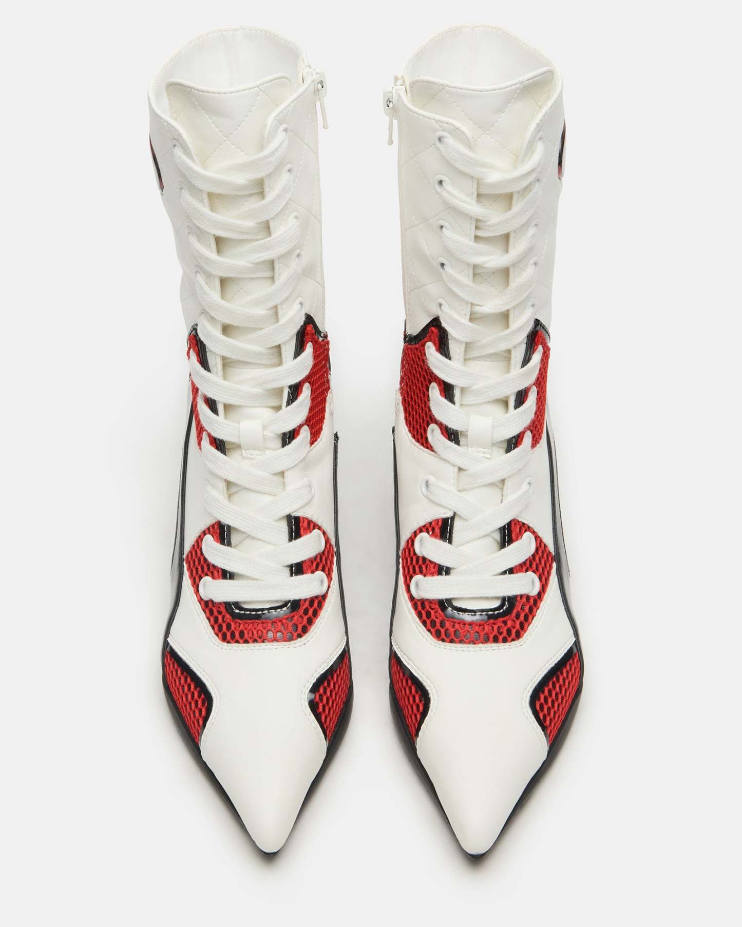 Elevate your footwear collection with the FANGIO, a sophisticated lace-up ankle bootie featuring a sleek pointed-toe and comfortable kitten heel. The striking color combination offers versatile styling options while maintaining a professional silhouette. Perfect for transitioning from office to evening with effortless elegance.