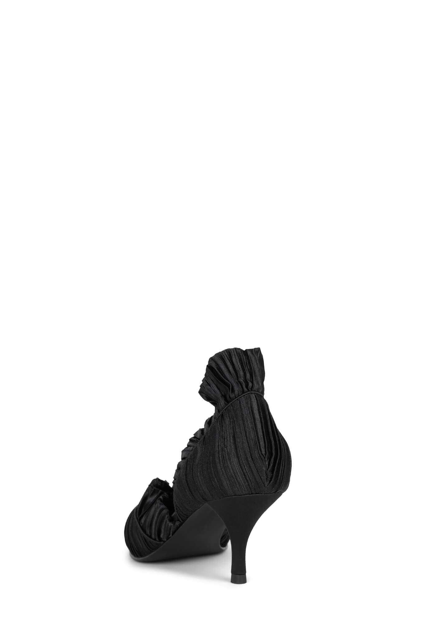 Two-piece pointed toe kitten heel pump with ruched satin and ruffles.