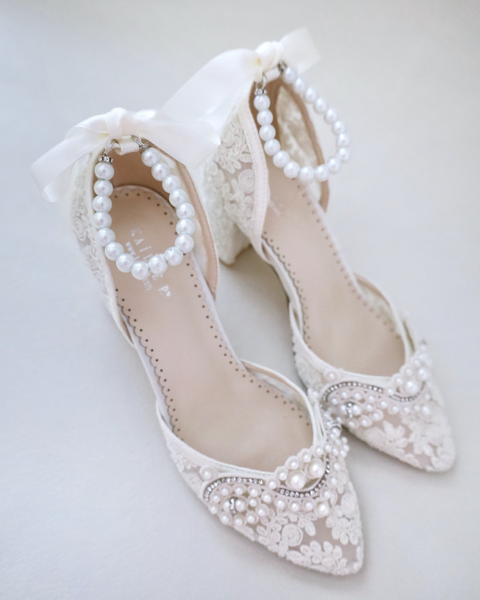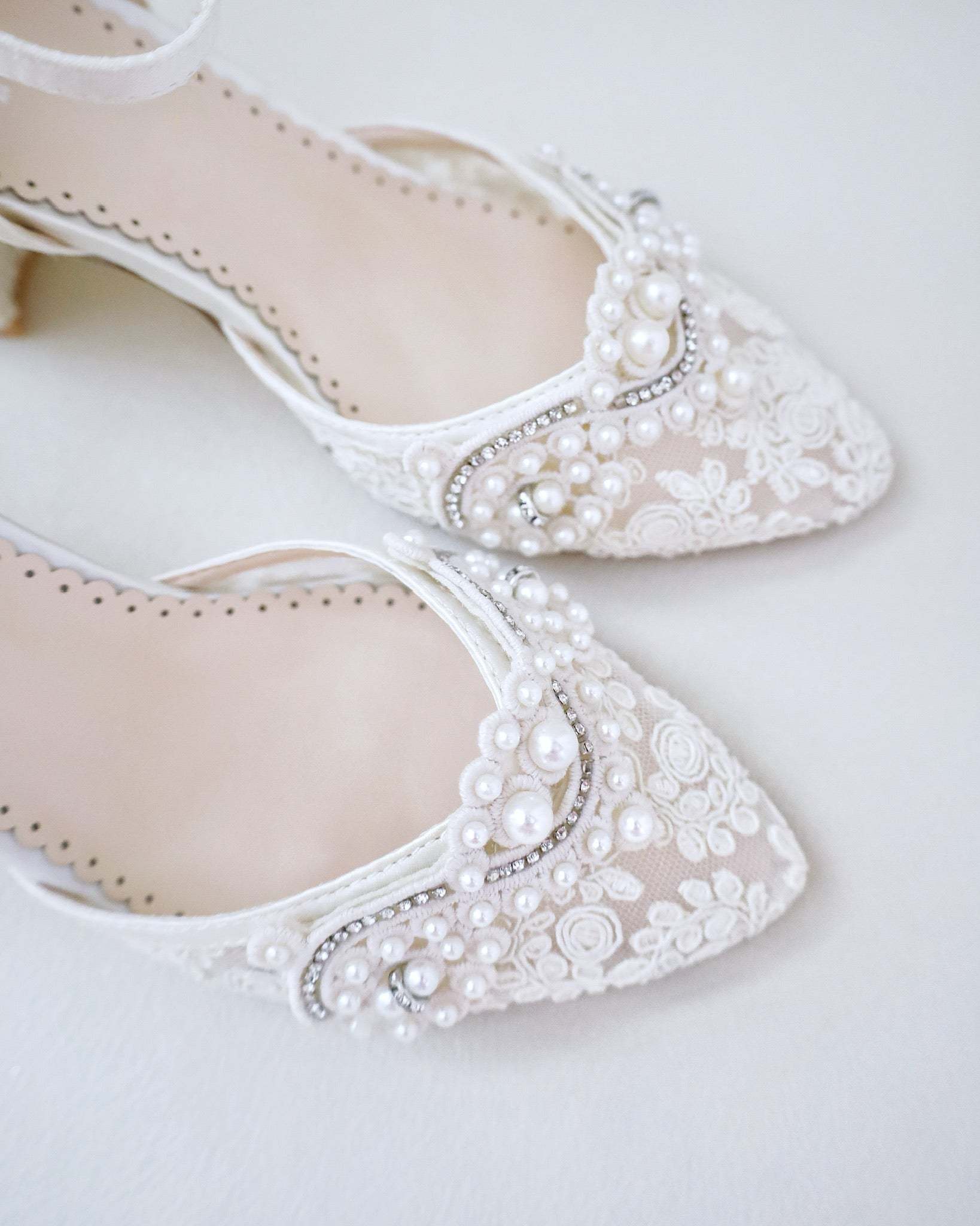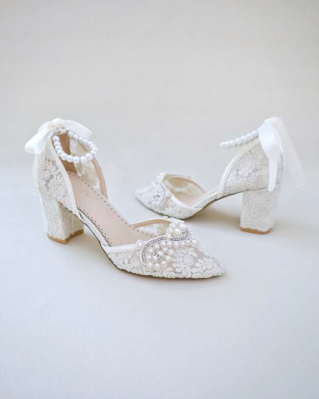 Lace Block Heel Pearl Ankle Wrap For Brides
