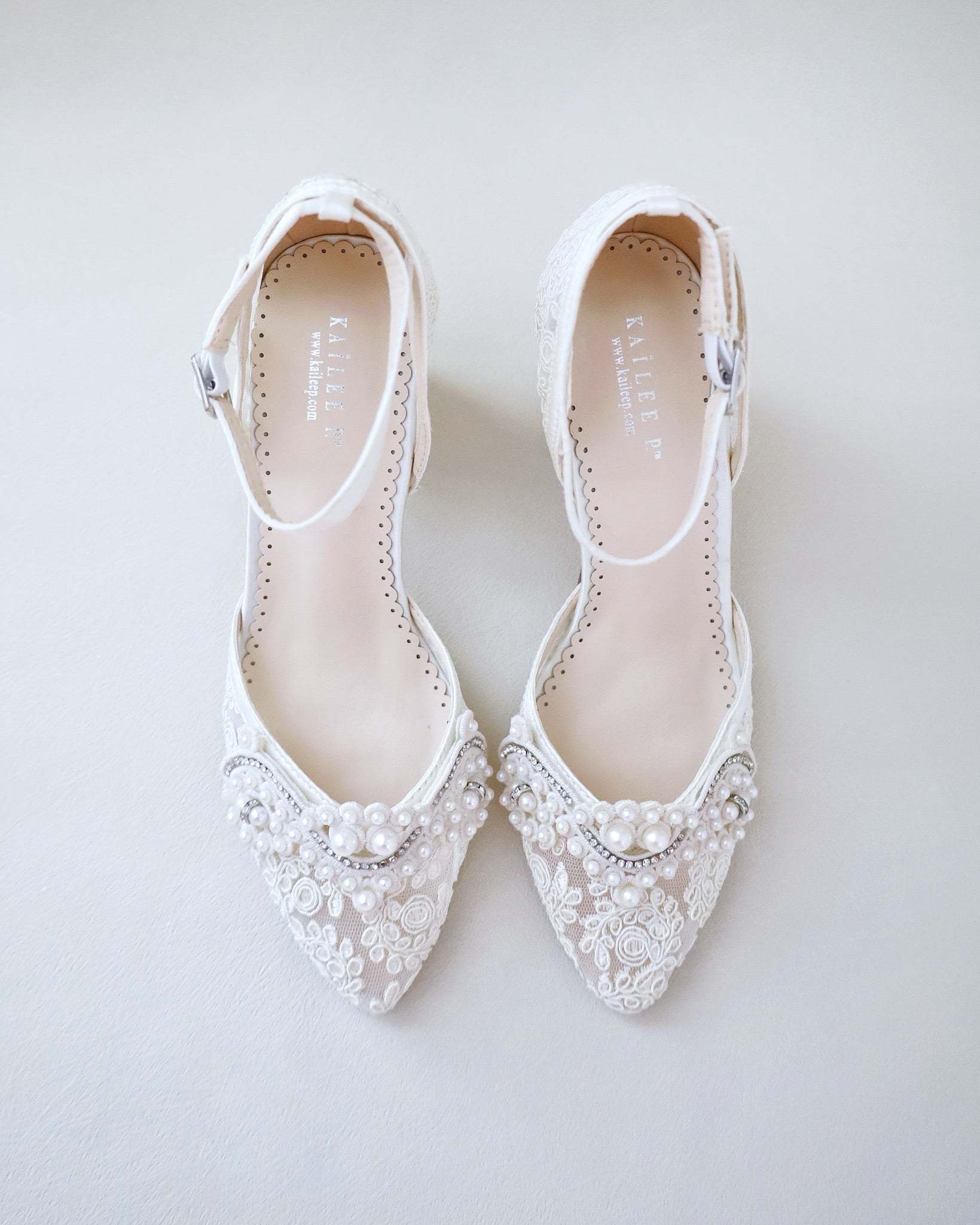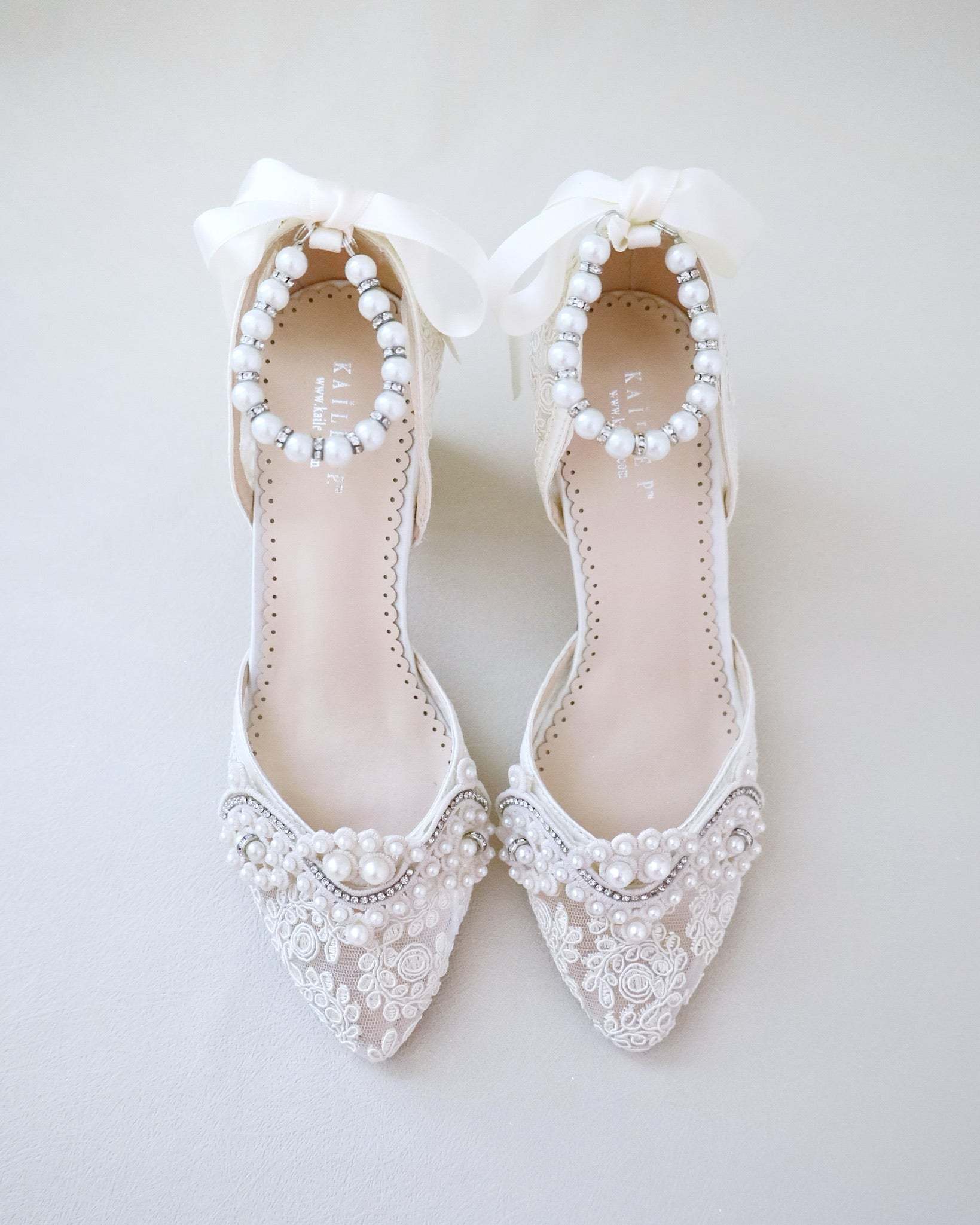 Crochet Lace Wedding Shoes Collection. Classic and refined almond toe crochet lace with added pearls applique. Choose from regular ankle straps or pearl ankle straps and tie silky ribbon bow at the back for a secure fitting. The luminous pearls makes this a classy and elegant bridal shoes.
