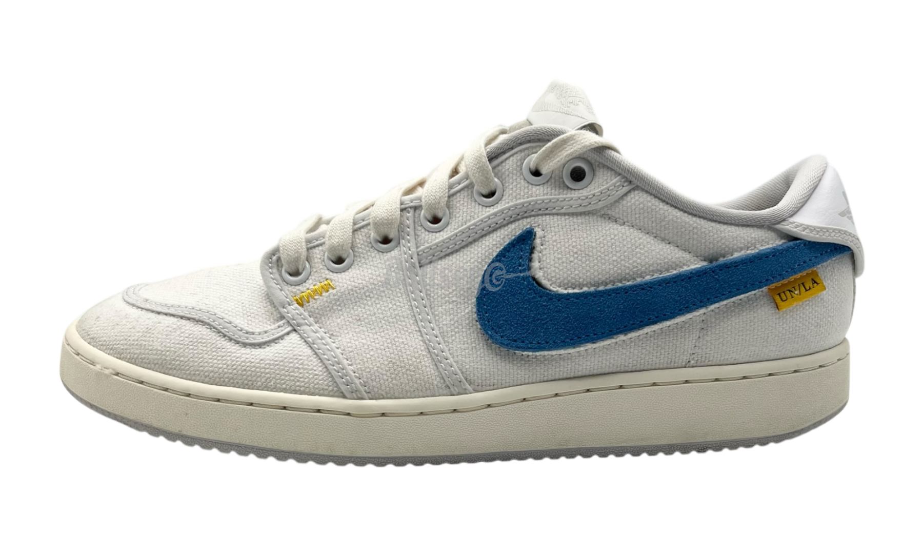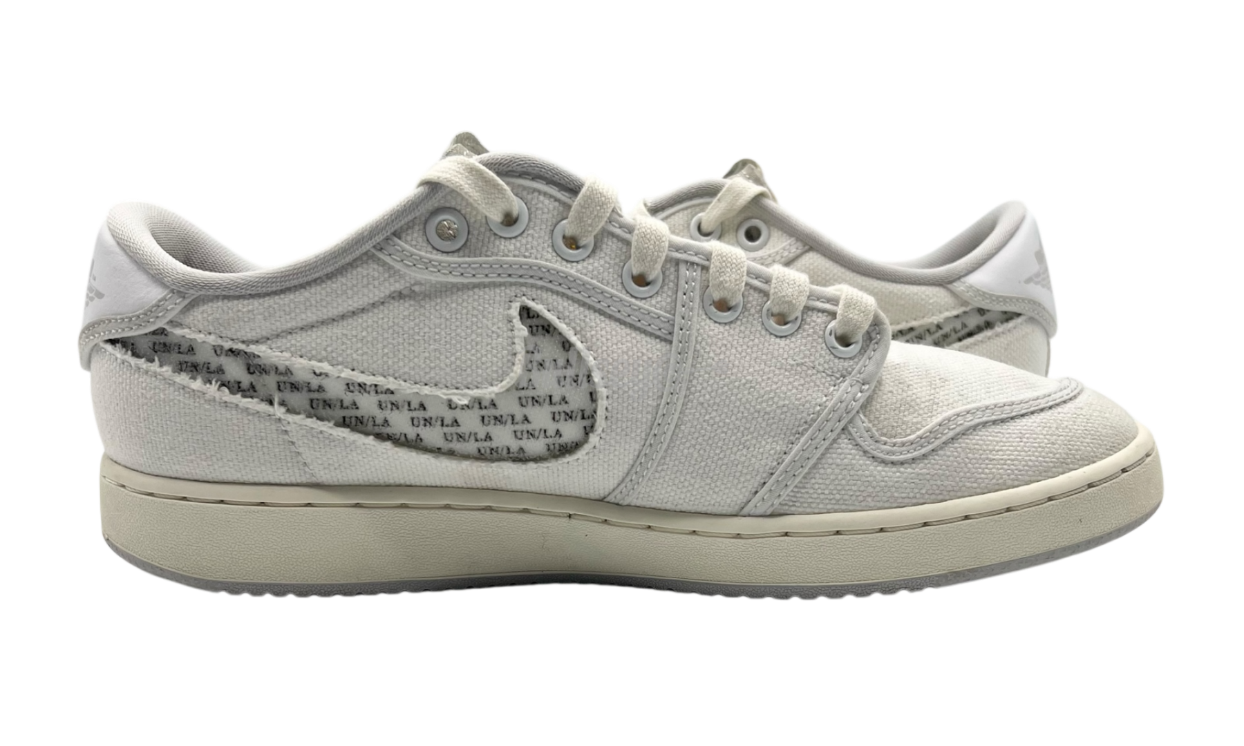 The Air Jordan 1 AJKO Low SP x Union "White Canvas" (Pre-Owned) is a creative reimagining of the classic AJ1 silhouette, brought to life through the lens of Los Angeles-based streetwear label Union. This collaborative design puts a fresh spin on the AJKO line, blending vintage Jordan DNA with Union’s signature touch. The low-top sneaker features a crisp White Canvas upper paired with Neutral Grey overlays, giving it a clean, deconstructed aesthetic that’s both minimalist and bold. Union’s distinct influence is seen in the exposed stitching, removable Swoosh patches via Velcro, and custom branding on the tongue and heel tab. These unique details offer a customizable look and add to the shoe’s one-of-a-kind appeal. The midsole is slightly aged, providing a subtle vintage vibe that complements the overall design.