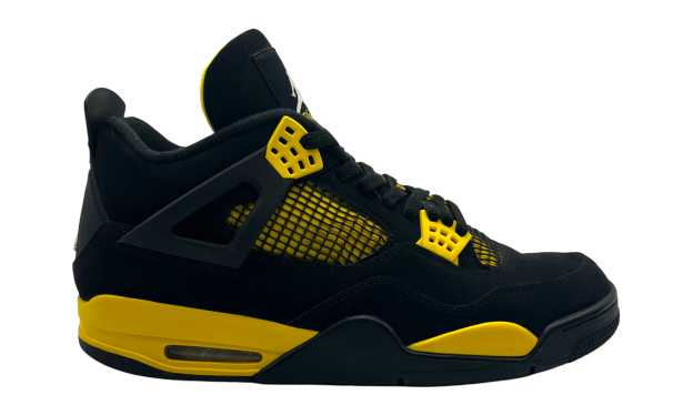 The 2023 edition of the Air Jordan 4 Retro 'Thunder' reintroduces the coveted colorway from its original 2006 release (and subsequent reissue in 2012). The upper is draped in smooth black nubuck, with eye-catching hits of yellow on the molded eyelets, quarter panel, and lower tongue, which are adorned with black netting. Jumpman branding is featured on the Flight tongue tag and molded heel tab. The sneaker boasts lightweight cushioning with a yellow polyurethane midsole, enhanced by an exposed Air-sole unit in the heel, providing exceptional comfort and support. Don't miss out on the Air Jordan 4 Retro 'Thunder' - a timeless classic for sneaker enthusiasts and collectors alike.