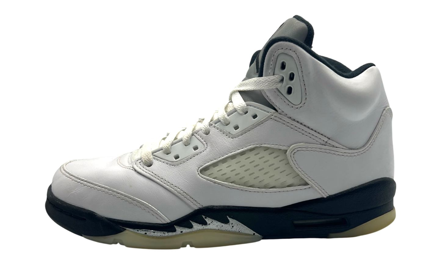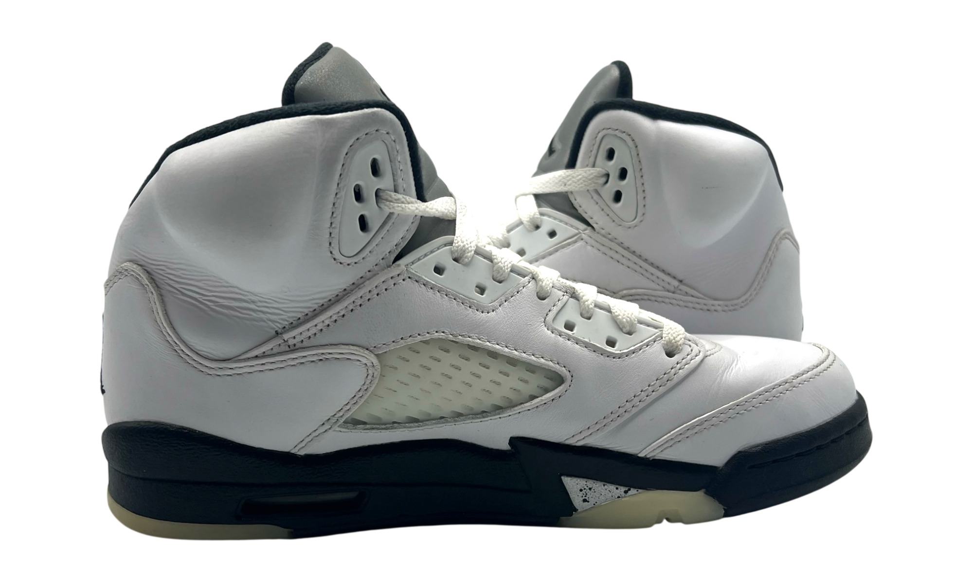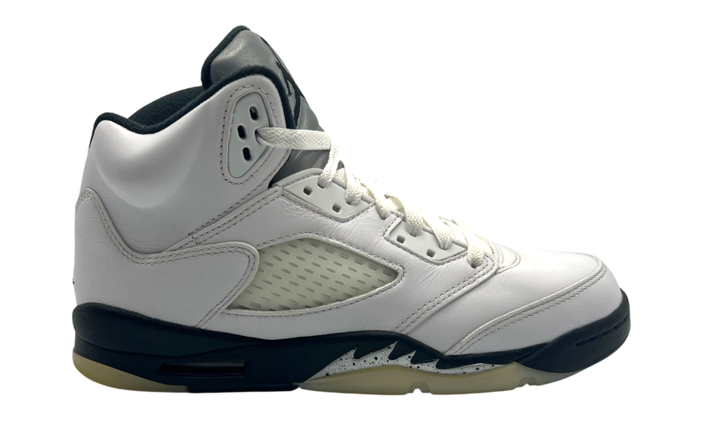 A fresh twist on a fan-favorite classic, the Air Jordan 5 Retro "Reverse Metallic" flips the iconic Black Metallic colorway with a bold new look. This version features a clean white leather upper accented by black midsole details and a metallic silver tongue, delivering sharp contrast and premium feel. The reflective tongue, icy translucent outsole, and classic lace lock system stay true to the AJ5's original DNA.