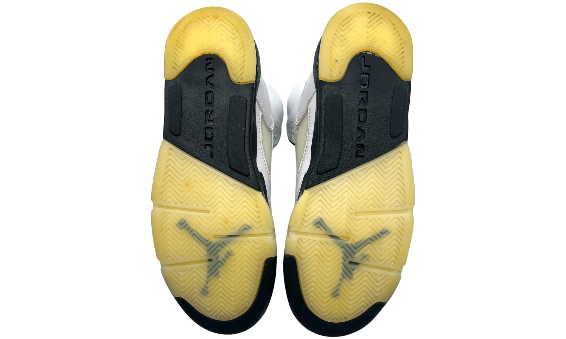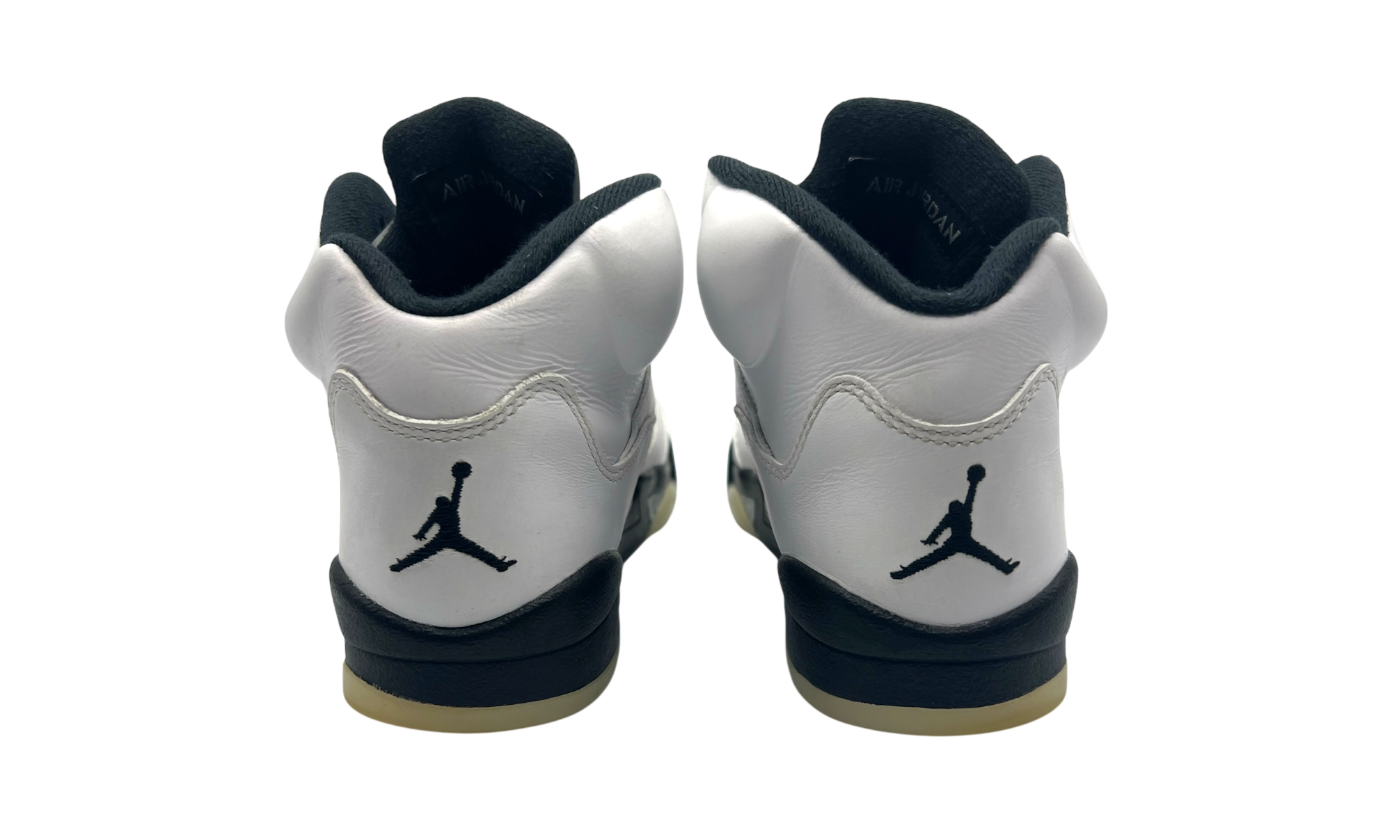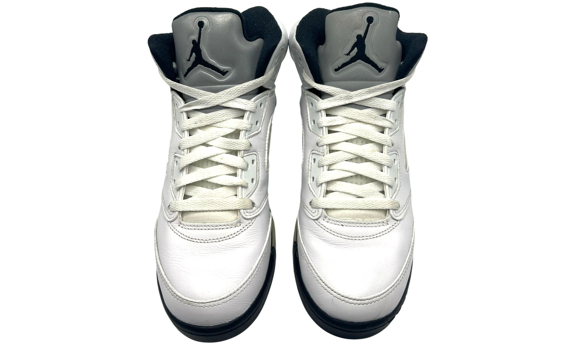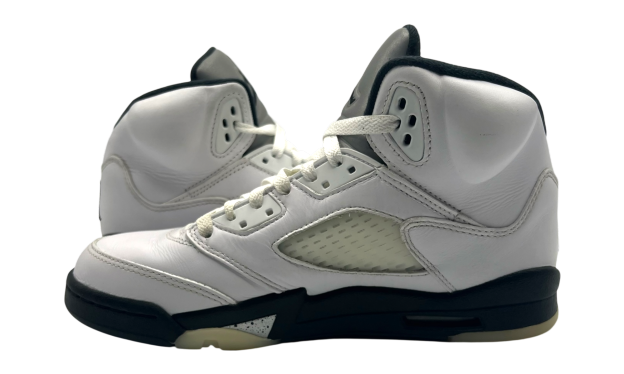 A fresh twist on a fan-favorite classic, the Air Jordan 5 Retro "Reverse Metallic" flips the iconic Black Metallic colorway with a bold new look. This version features a clean white leather upper accented by black midsole details and a metallic silver tongue, delivering sharp contrast and premium feel. The reflective tongue, icy translucent outsole, and classic lace lock system stay true to the AJ5's original DNA.