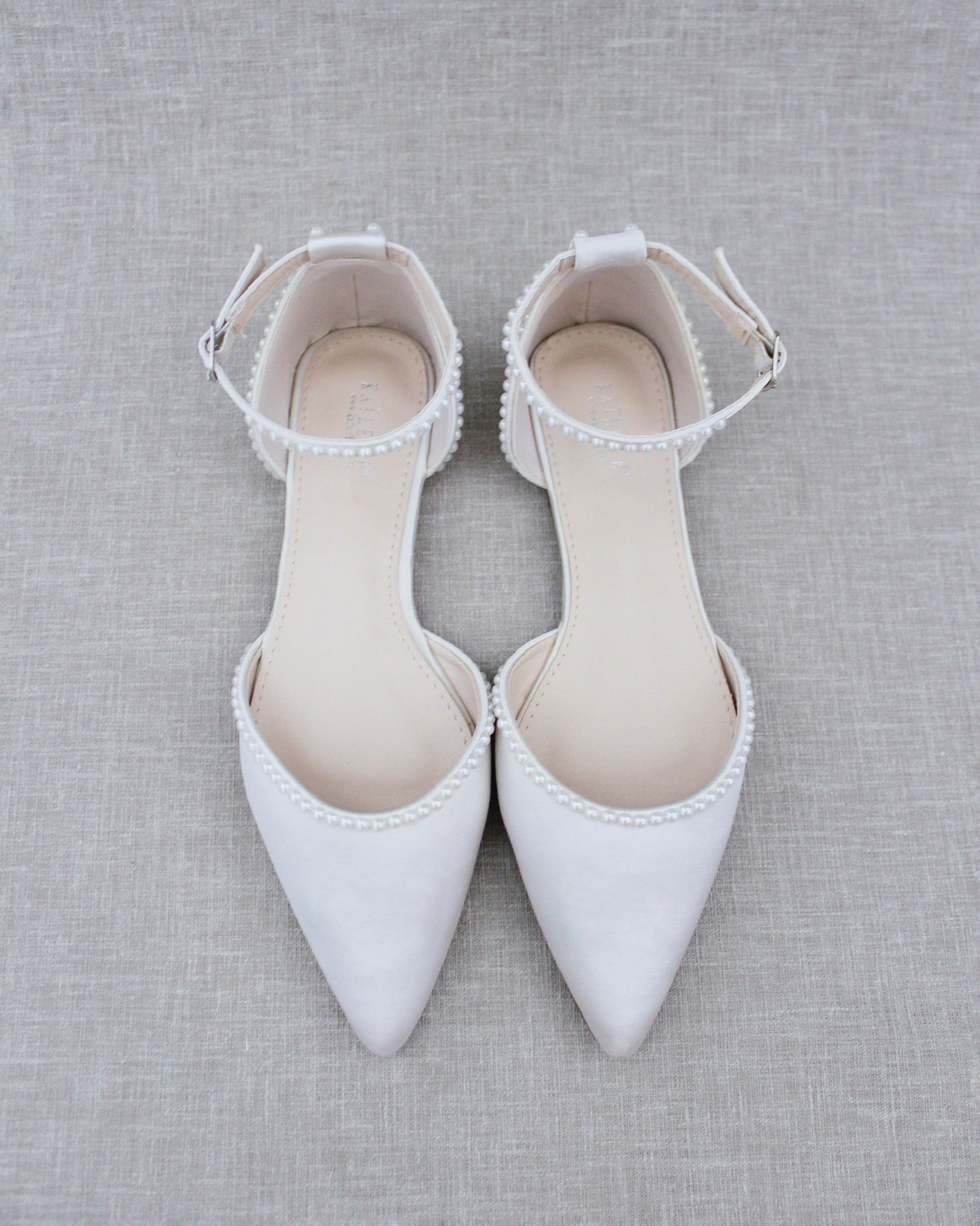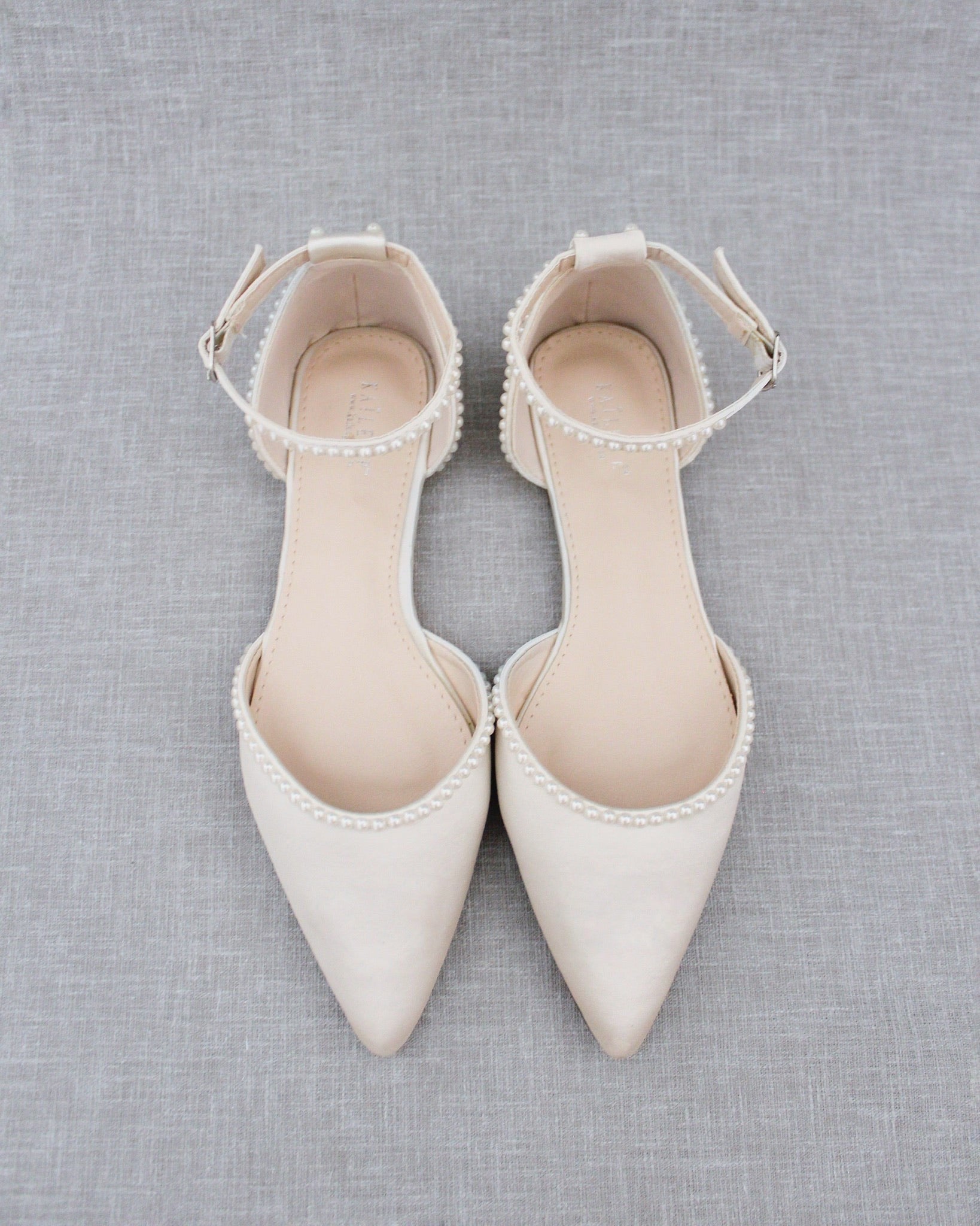 Satin Pointy Toe Flats with Mini Pearls and Ankle Strap