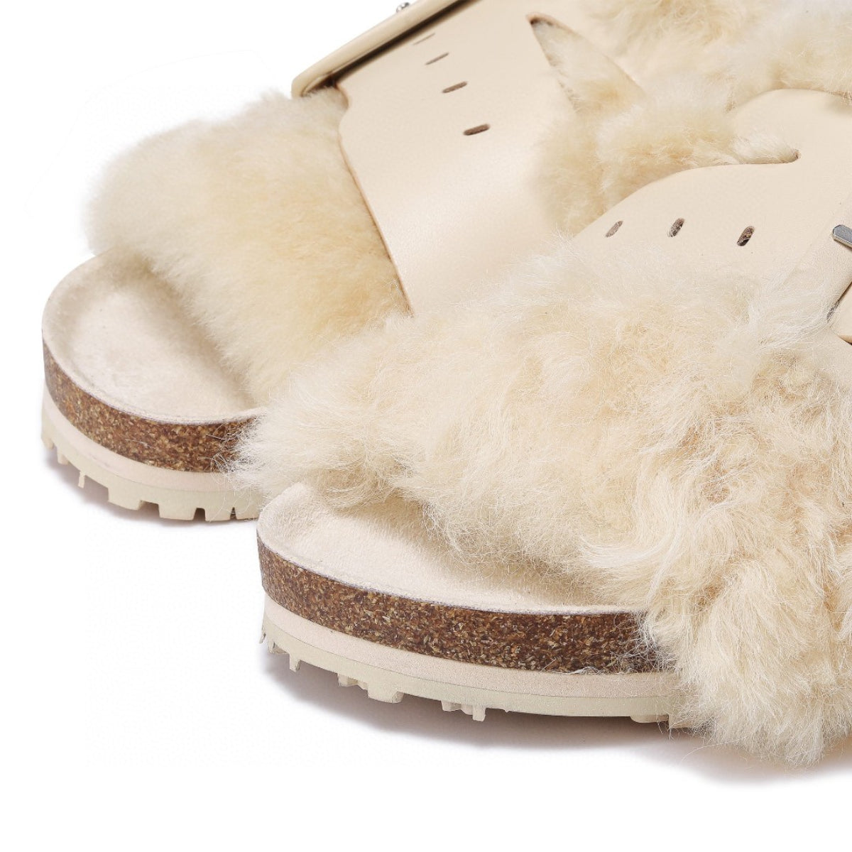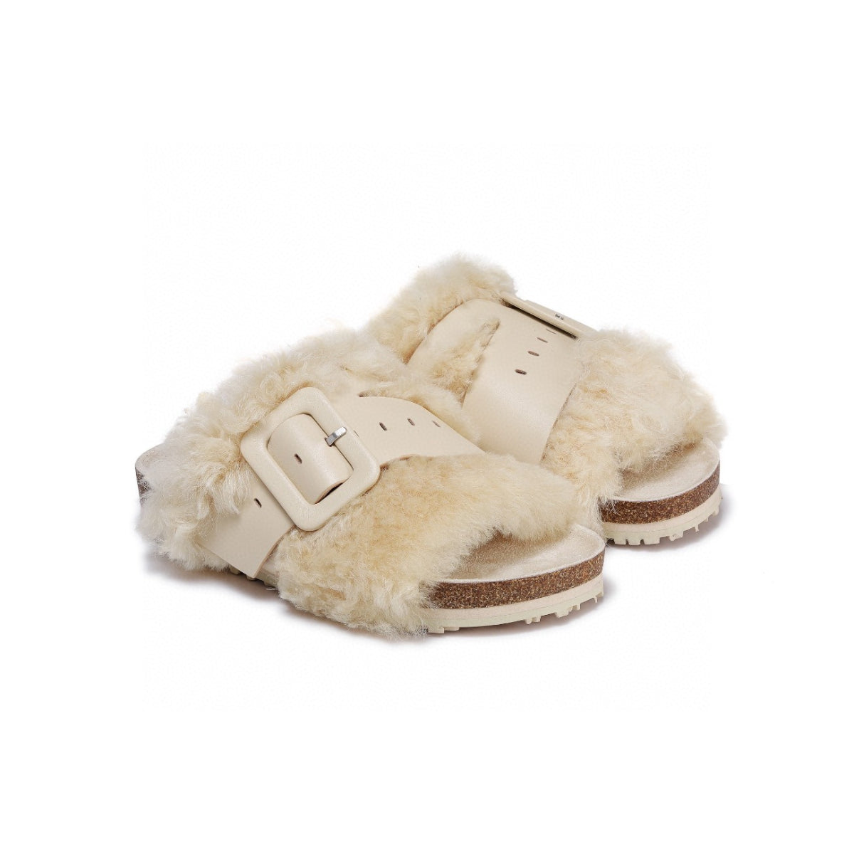 Lost In Echo Leather Strap Buckle Fluffy Slides Cream