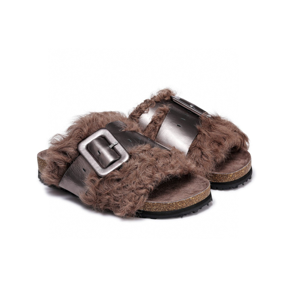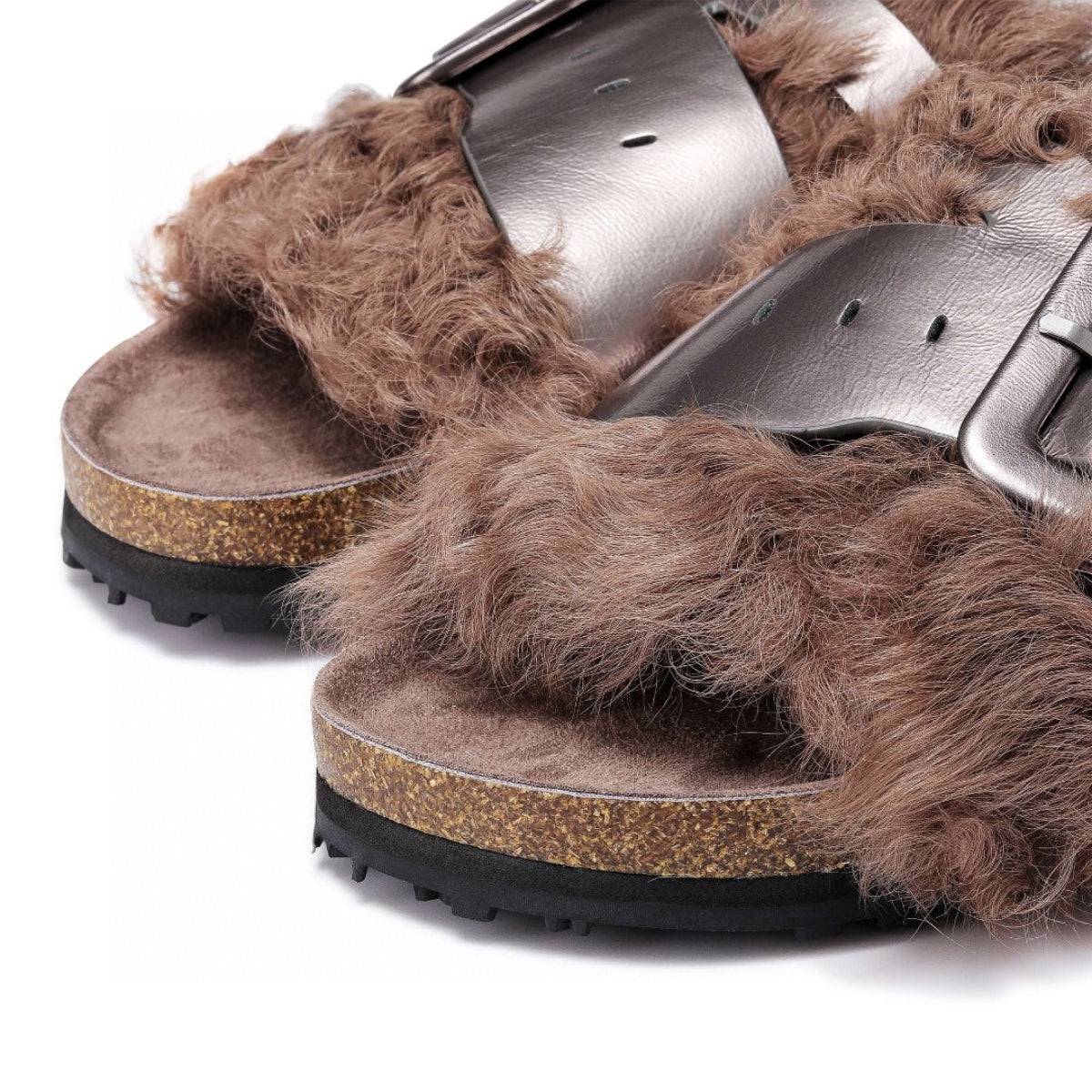 Lost In Echo Leather Strap Buckle Fluffy Slides Brown