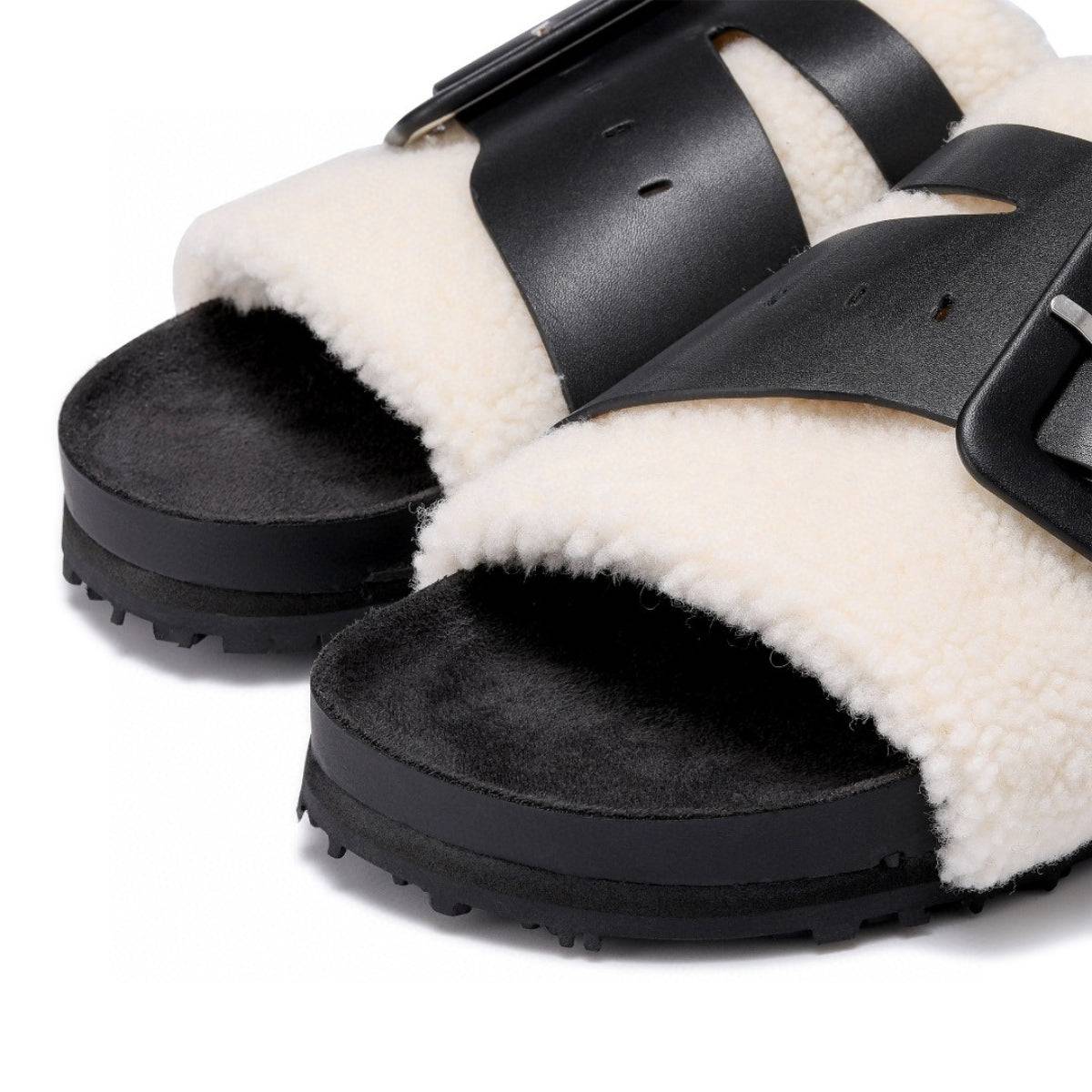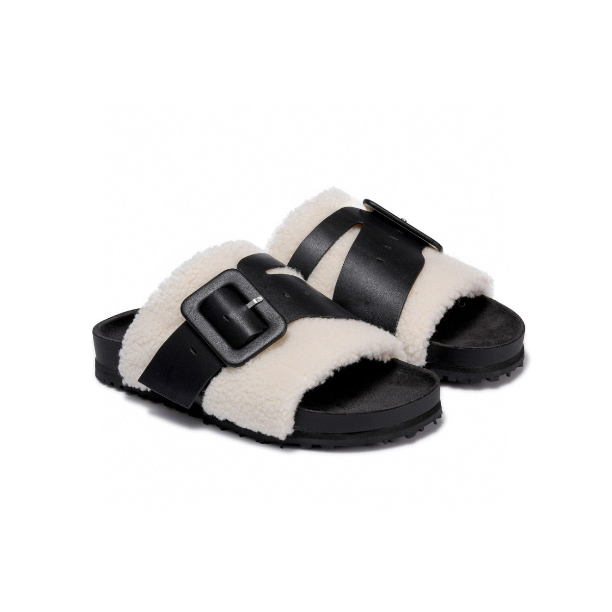 Lost In Echo Leather Strap Buckle Fluffy Slides Black
