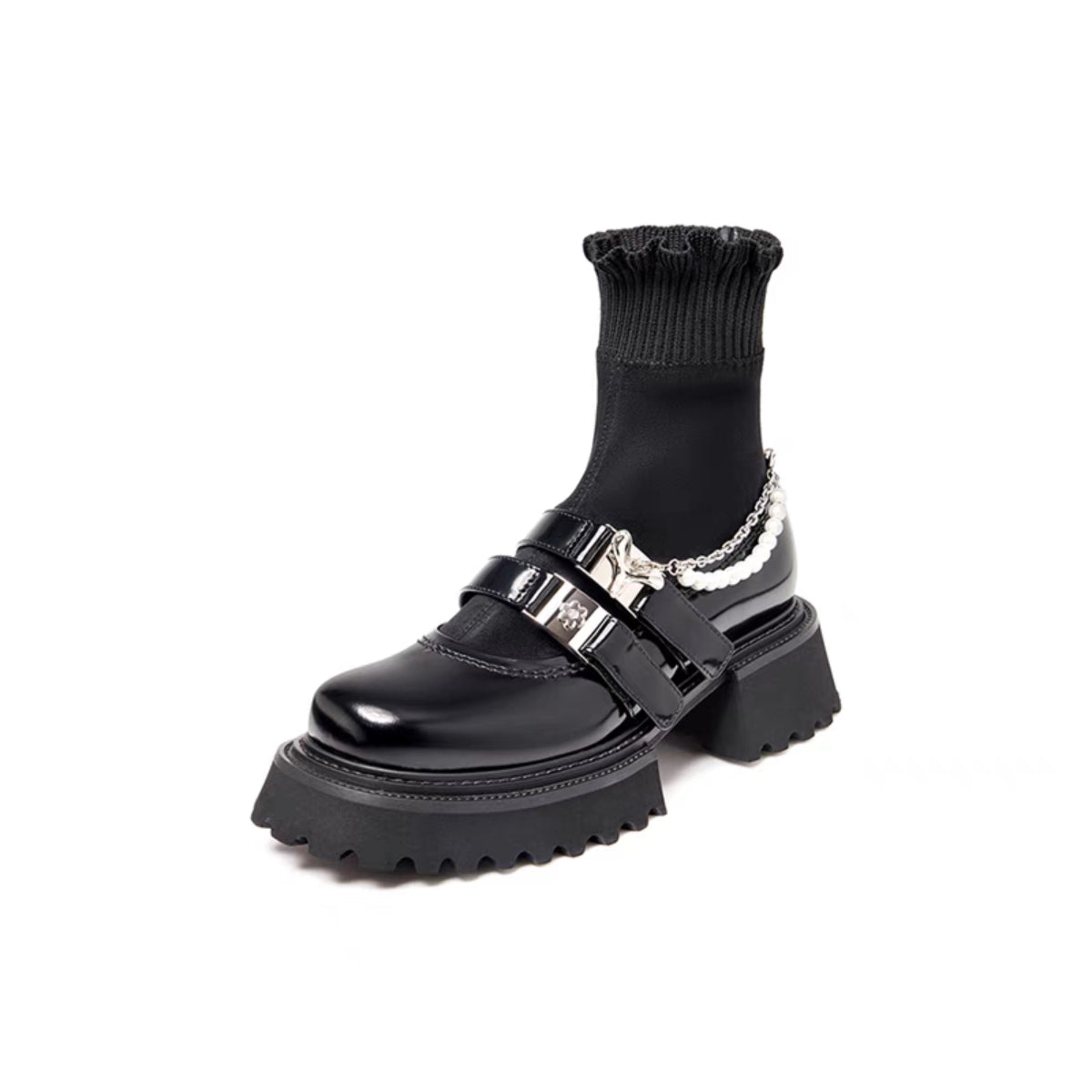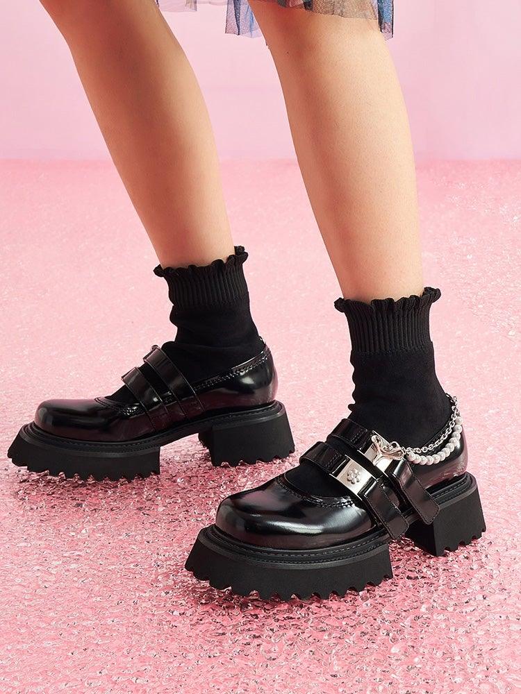 SugarSu Pearl Chain Double Buckle Stocking Boots Black