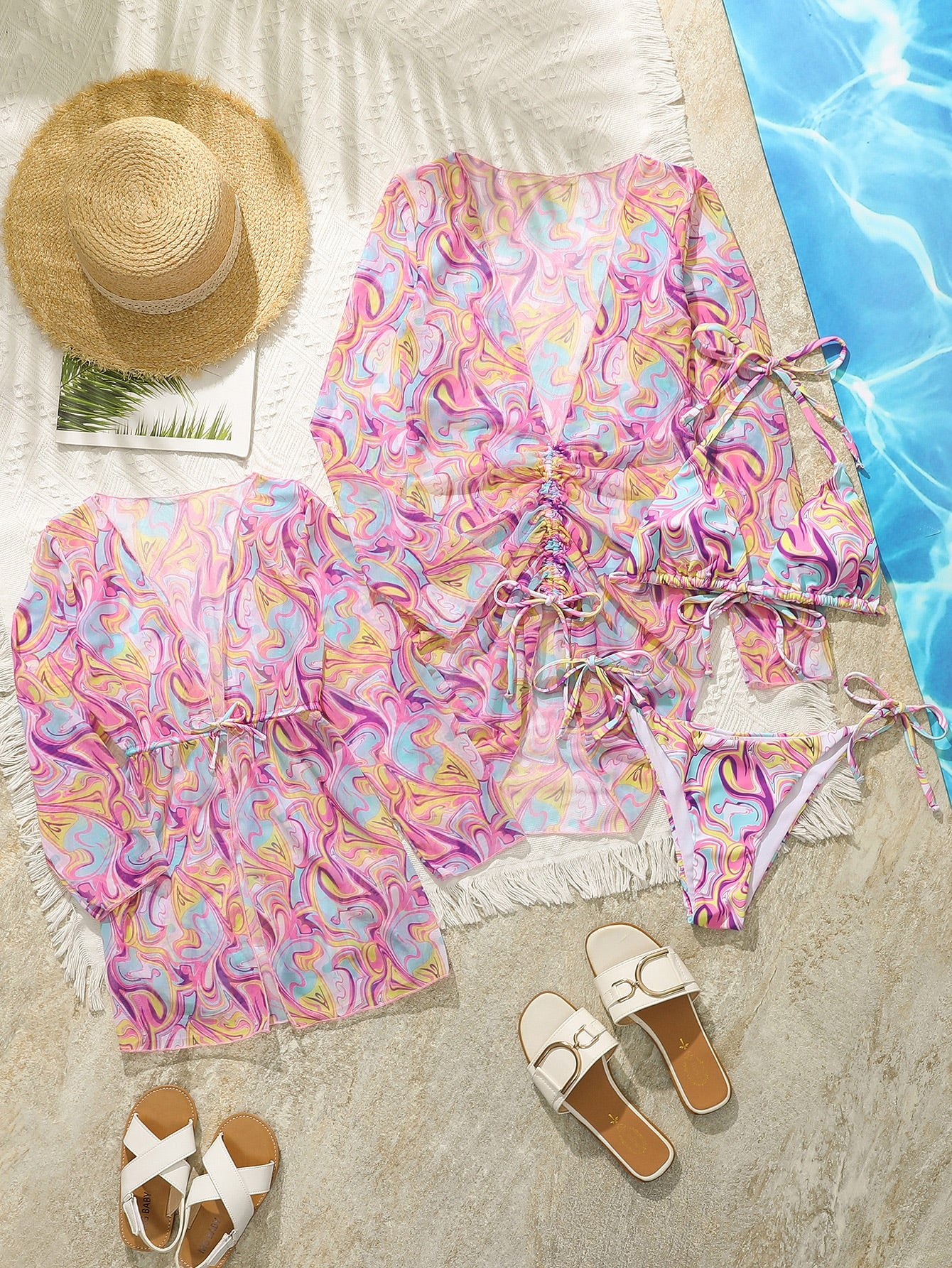 Marble Print Triangle Bikini Swimsuit With Kimono
