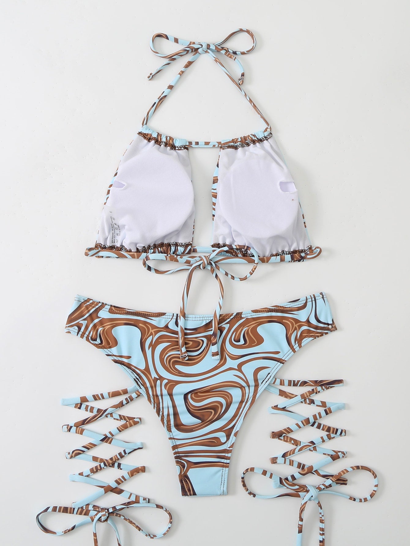 3pack Marble Print Halter Triangle Tie Side Bikini Swimsuit