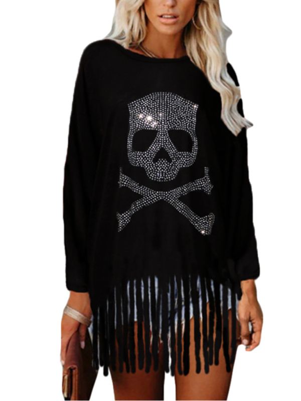 Women's Halloween hot drill skull bat long-sleeved T-shirt