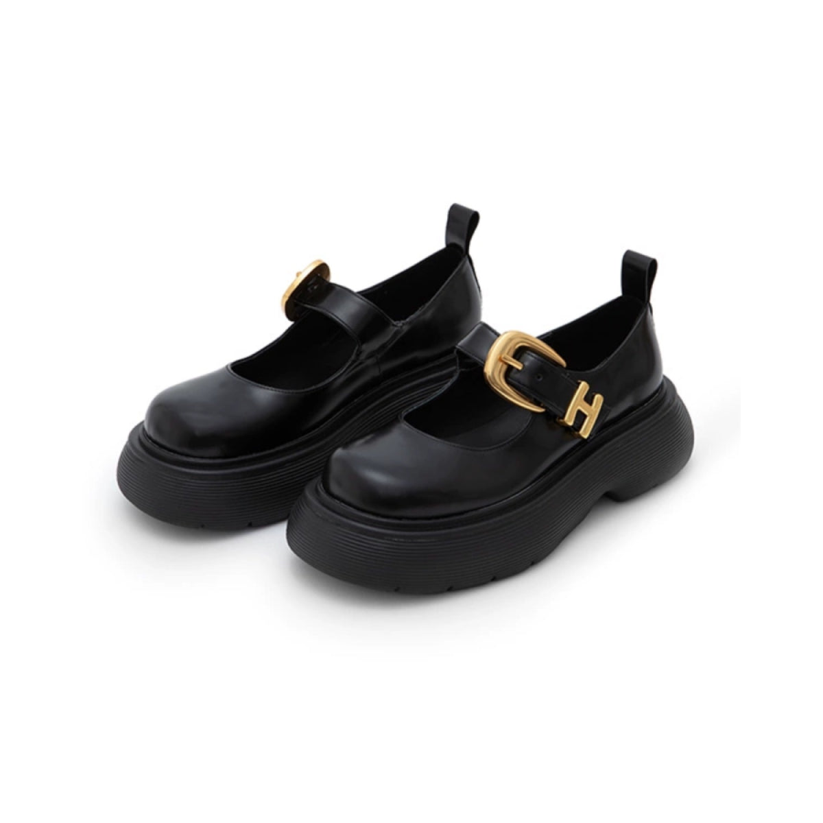 Herlian Logo Buckle Thick Sole Leather Mary Jane Black