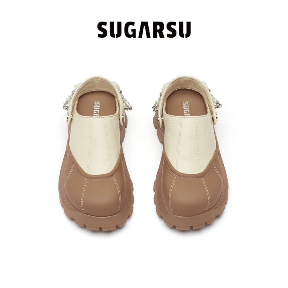 SugarSu Pearl Chain Decorated Tip-Tilt Clog Mules Khaki