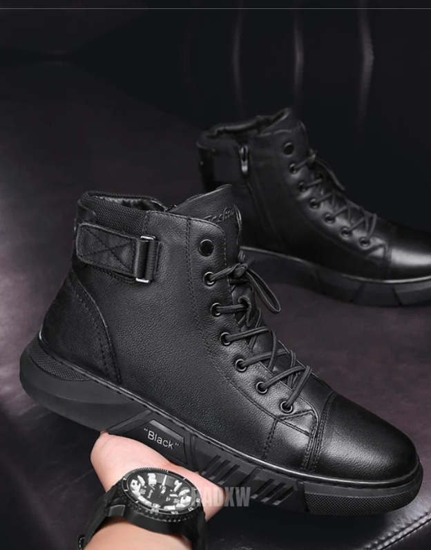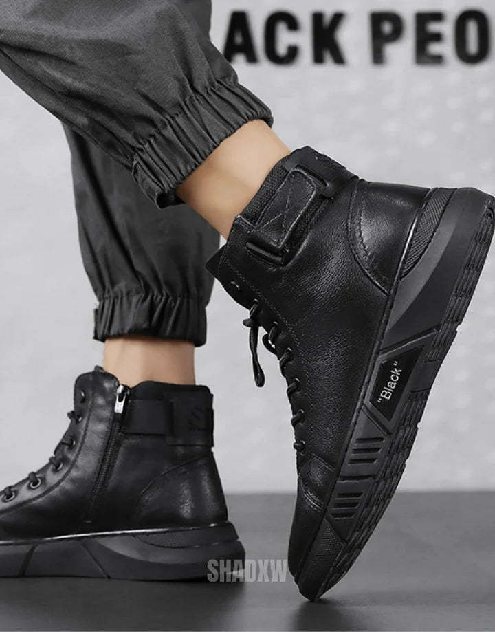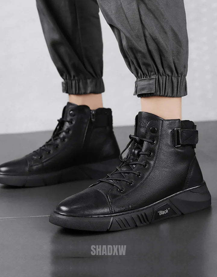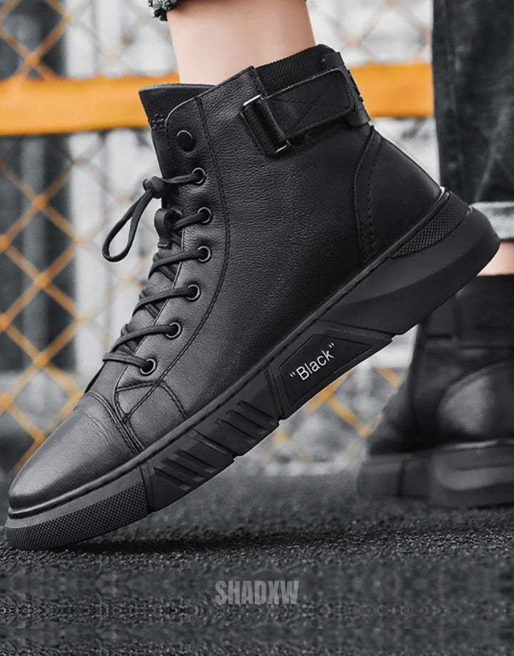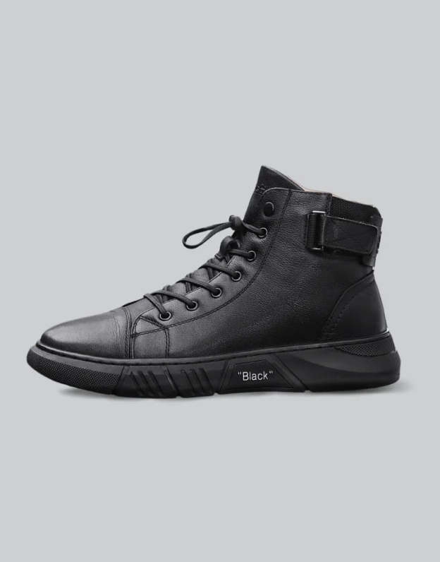 Our men's high-top leather sneakers are meticulously designed for ergonomic comfort. The interior boasts a cushioned insole and a breathable lining that together create an exceptionally comfortable experience for day-long wear. Whether you're traversing the urban jungle or attending an informal gathering. the ergonomic high-top construction provides the added benefit of ankle support. making it an ideal pick for individuals who lead an active lifestyle.