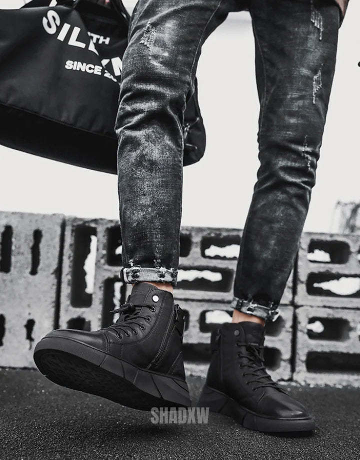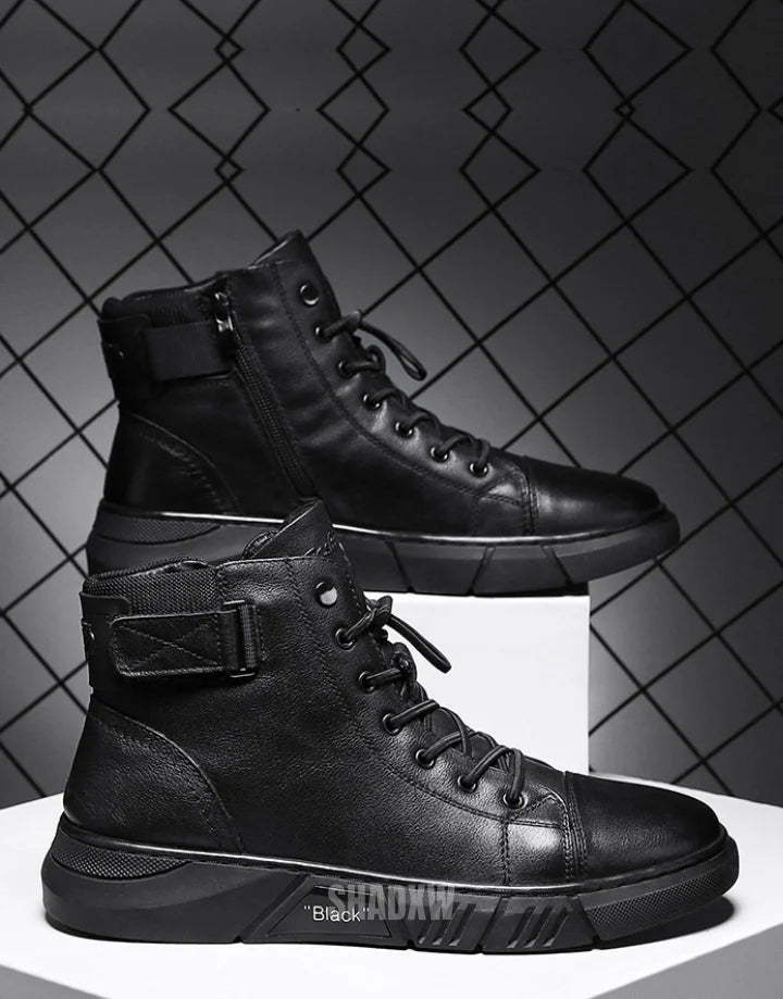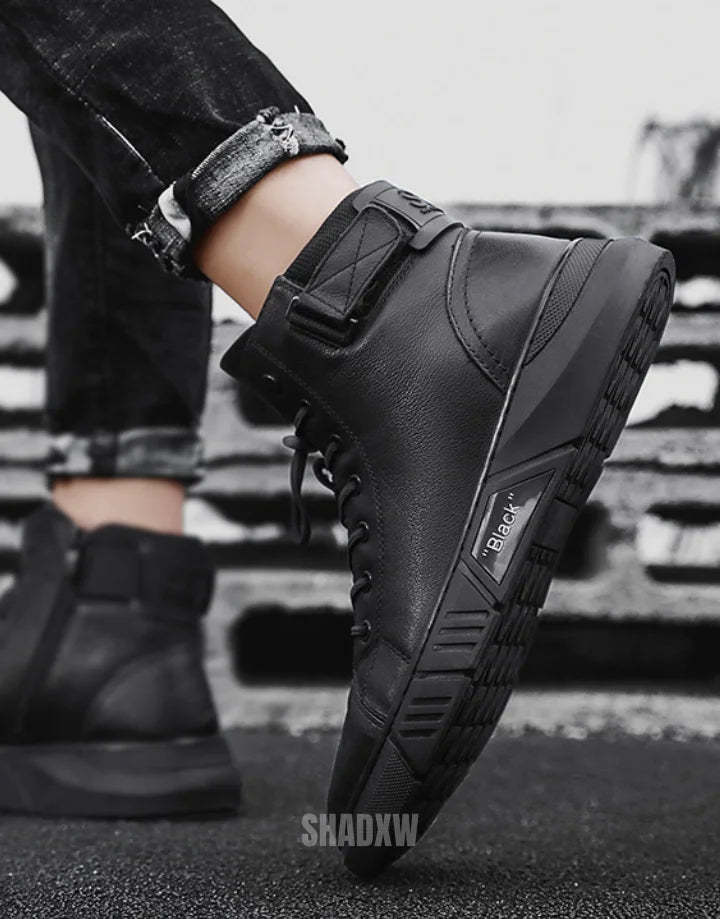 Engineered to adhere to the loftiest standards of craftsmanship and style. these high-top sneakers encapsulate the essence of cutting-edge fashion and utility. Fabricated from top-grade PU black leather. the sneakers are not just an aesthetic triumph but also a paragon of durability. Capable of standing up to everyday wear and tear. they sustain their original sheen and quality over time.