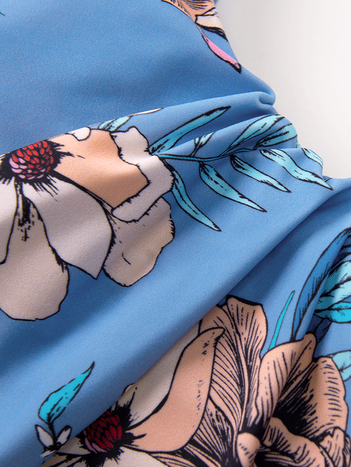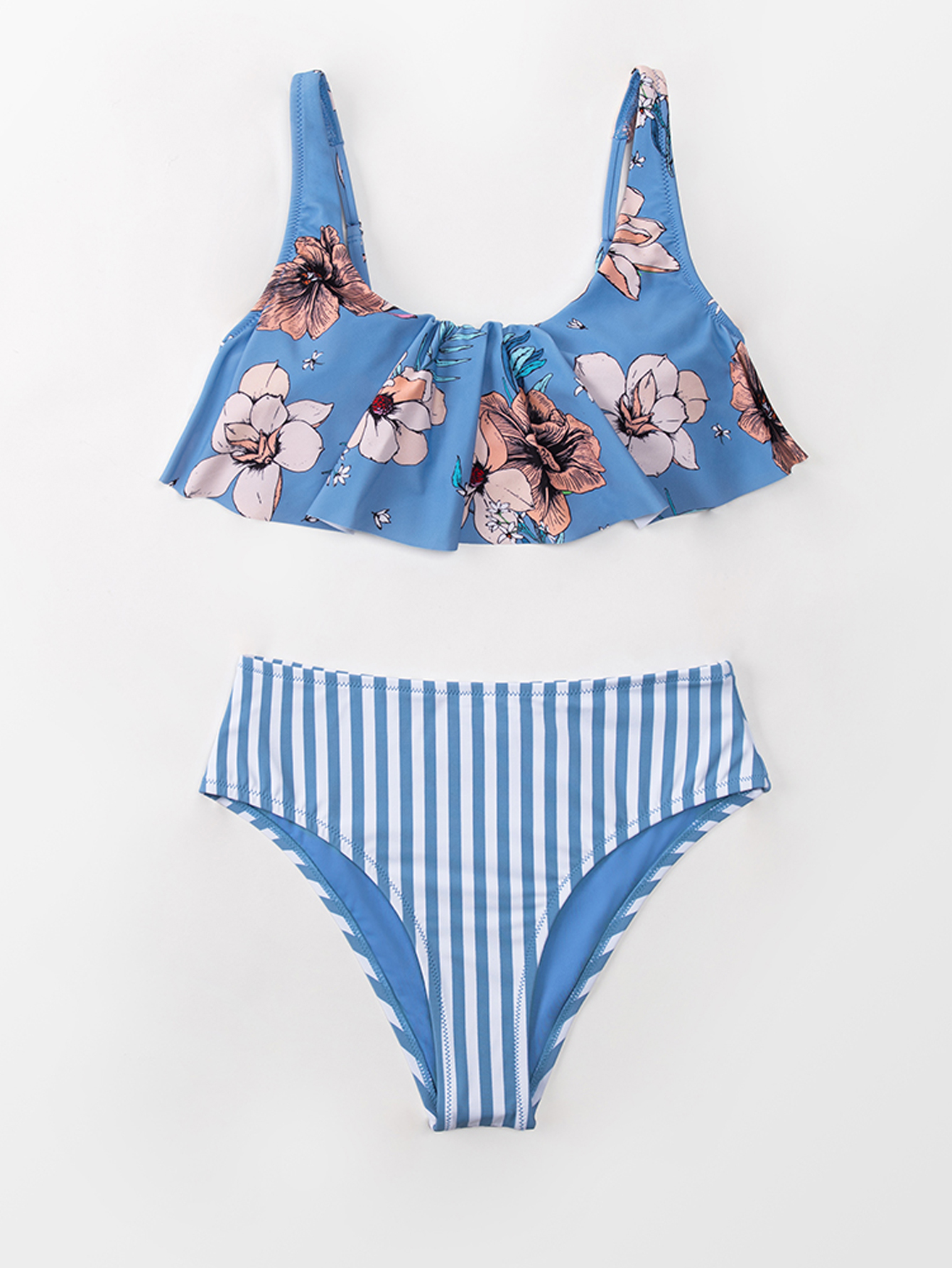 Blue Floral Striped Mid Waist Bikini Sets