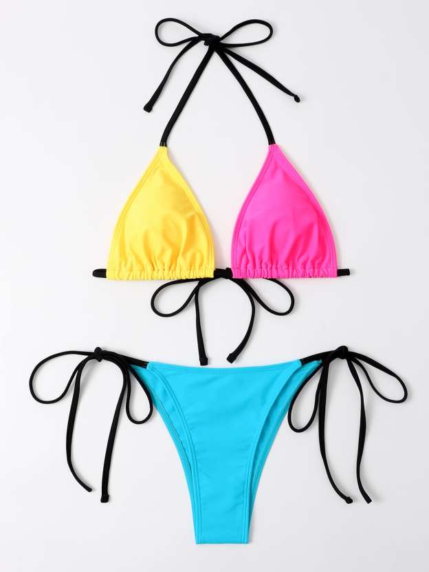 Colorblock Tie Back Triangle Thong Bikini Swimsuit