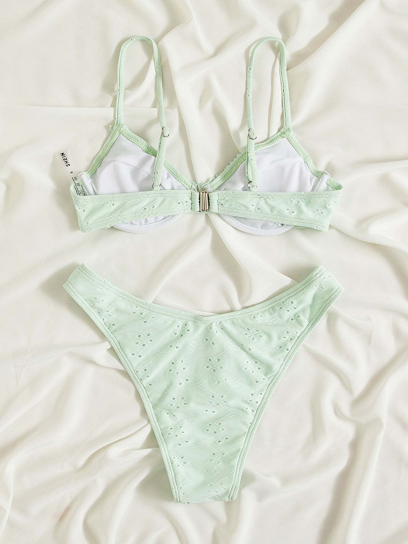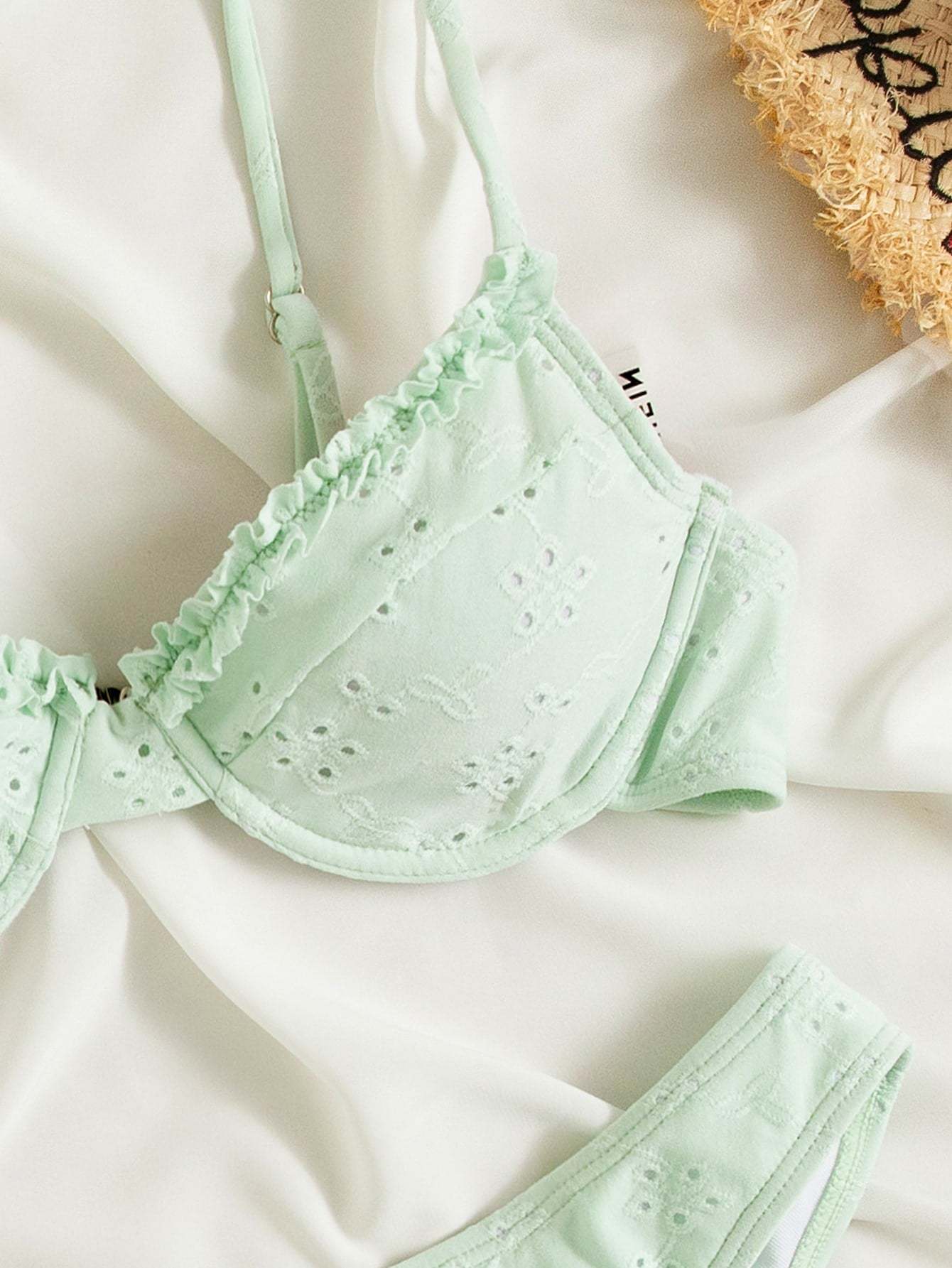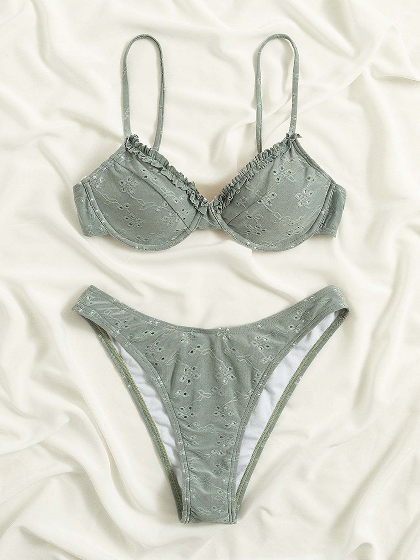 Frill Trim Eyelet Embroidery Push Up Bikini Swimsuit