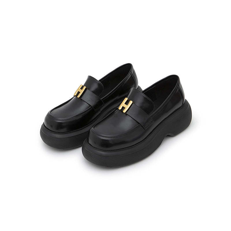 Herlian Logo Buckle Thick Sole Leather Loafer Black
