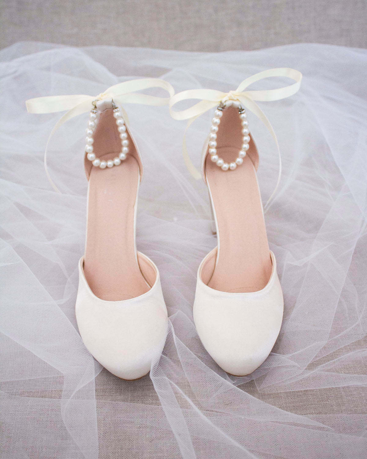 Satin Block Heel with Pearls Ankle Strap