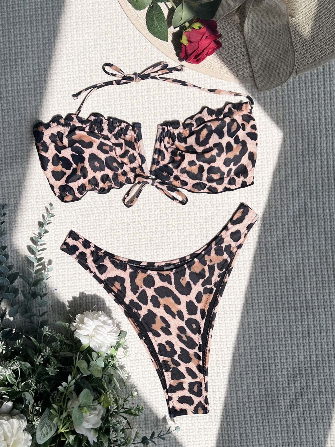 Leopard Print Frilled Halter Bikini Swimsuit