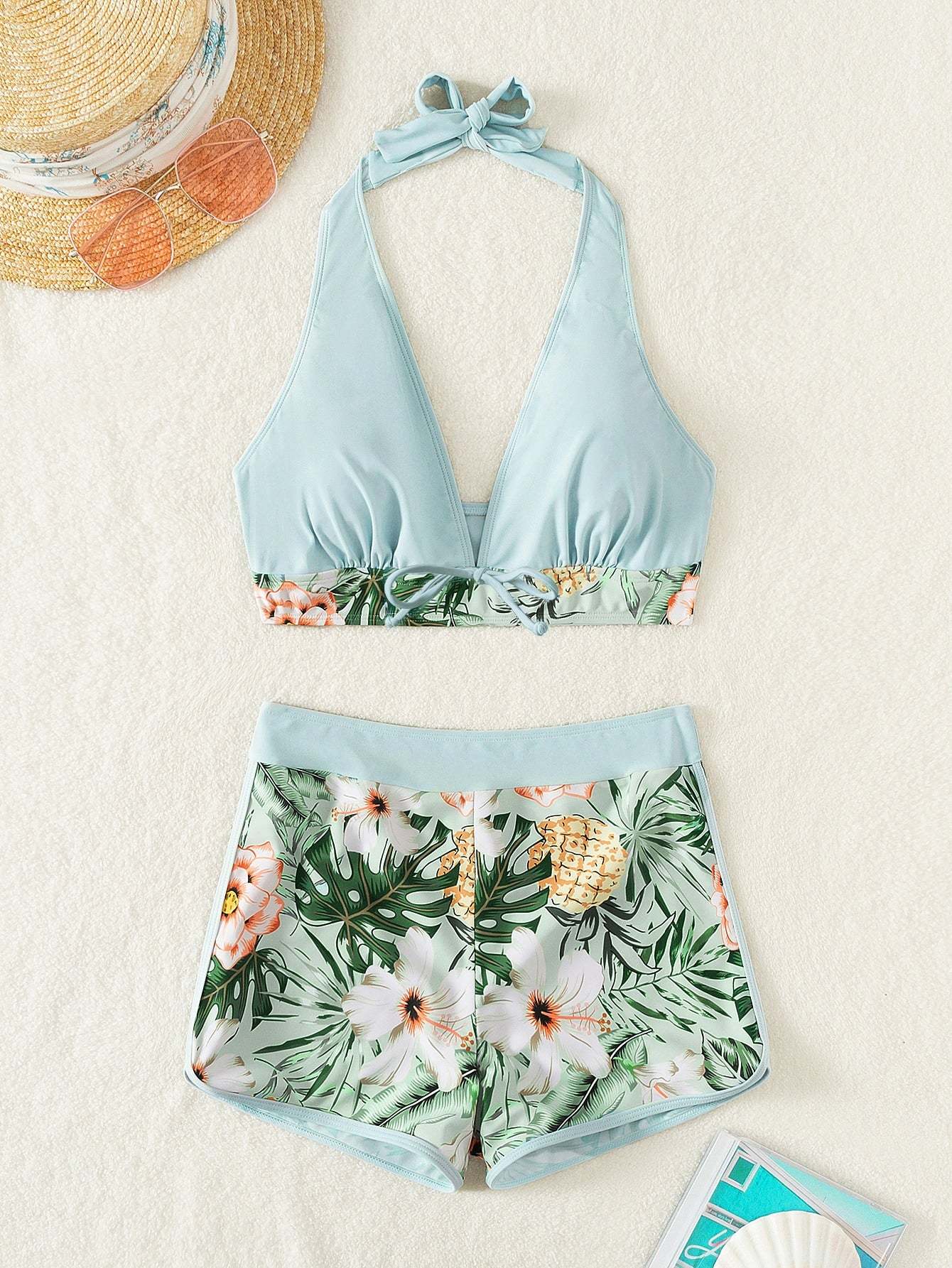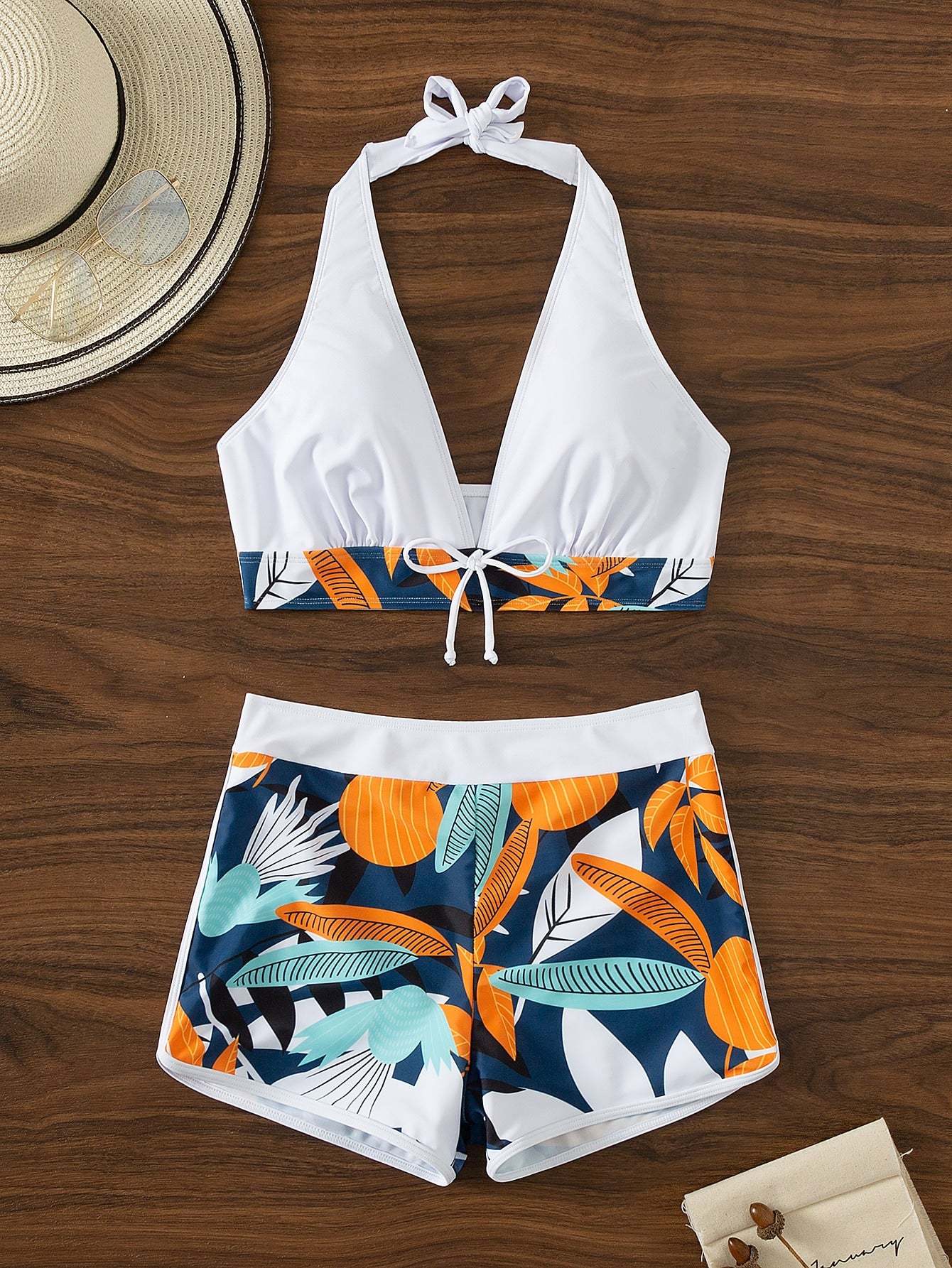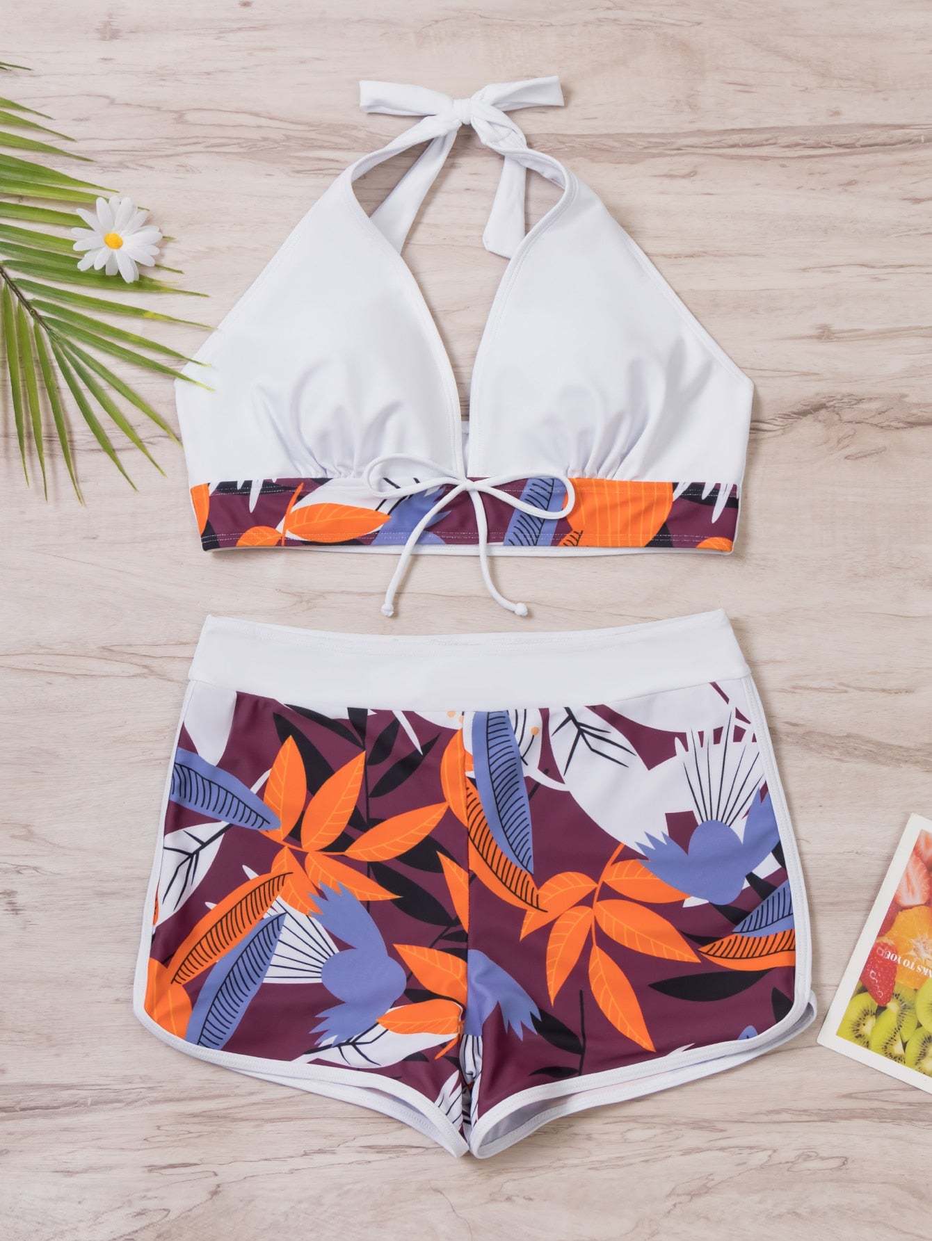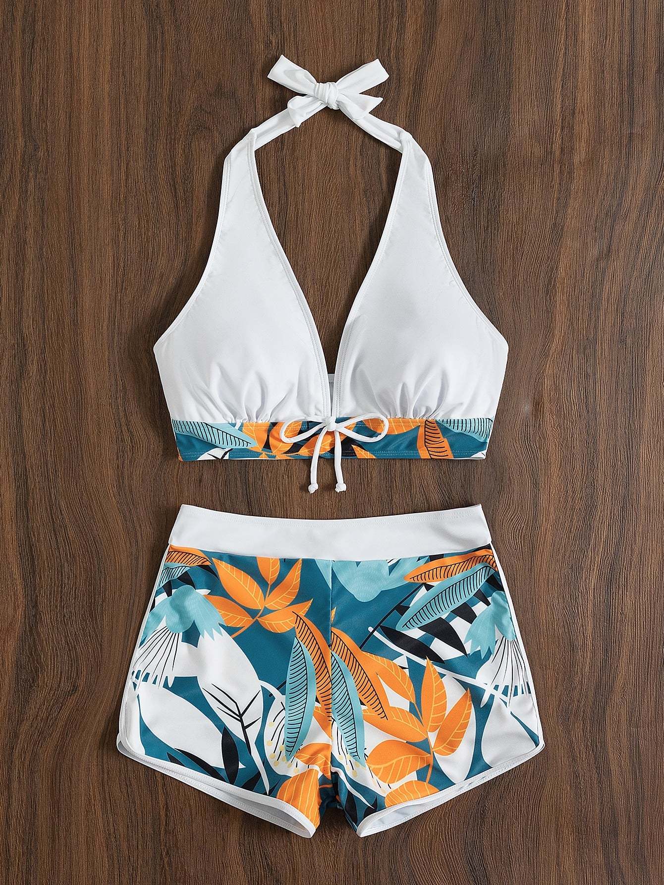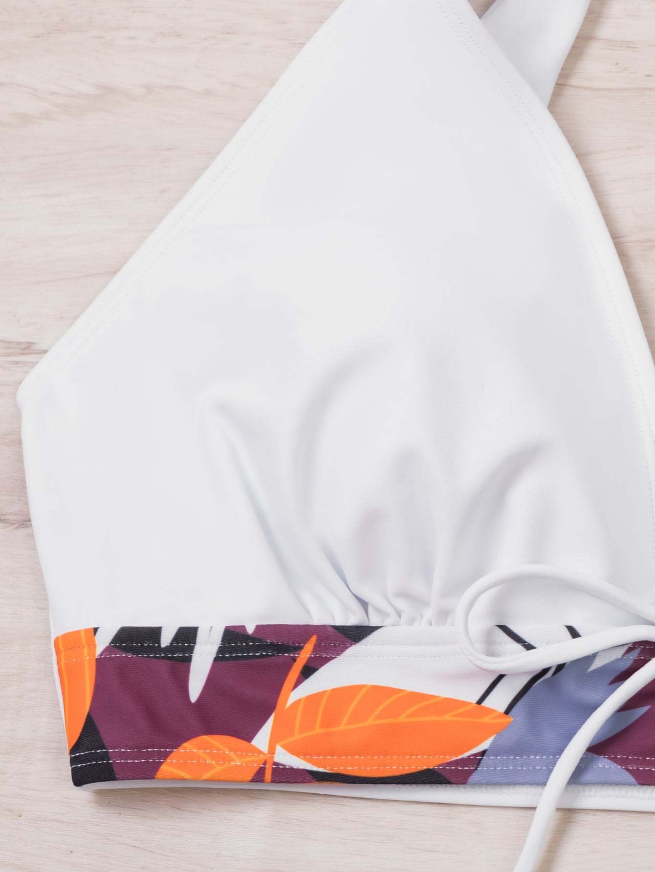 Random Leaf Print Tie Front Halter Bikini Swimsuit