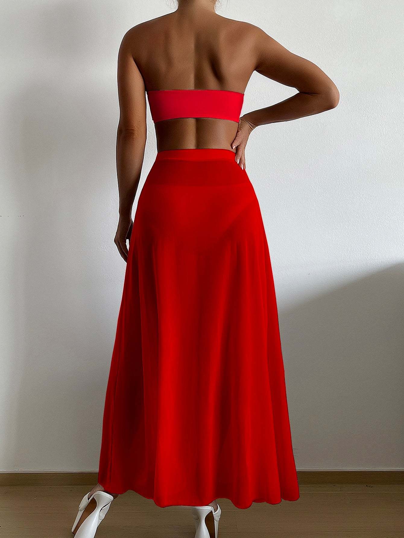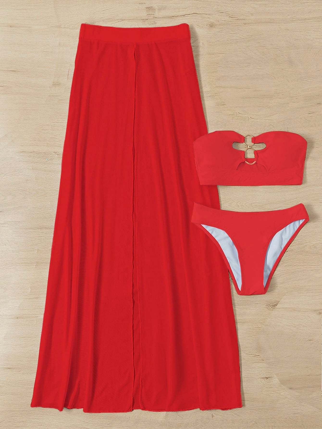 Ring Linked Bandeau Bikini Swimsuit & Mesh Cover Up Skirt