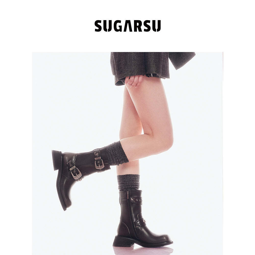 SugarSu Double Metal Buckle Leather Boots Black