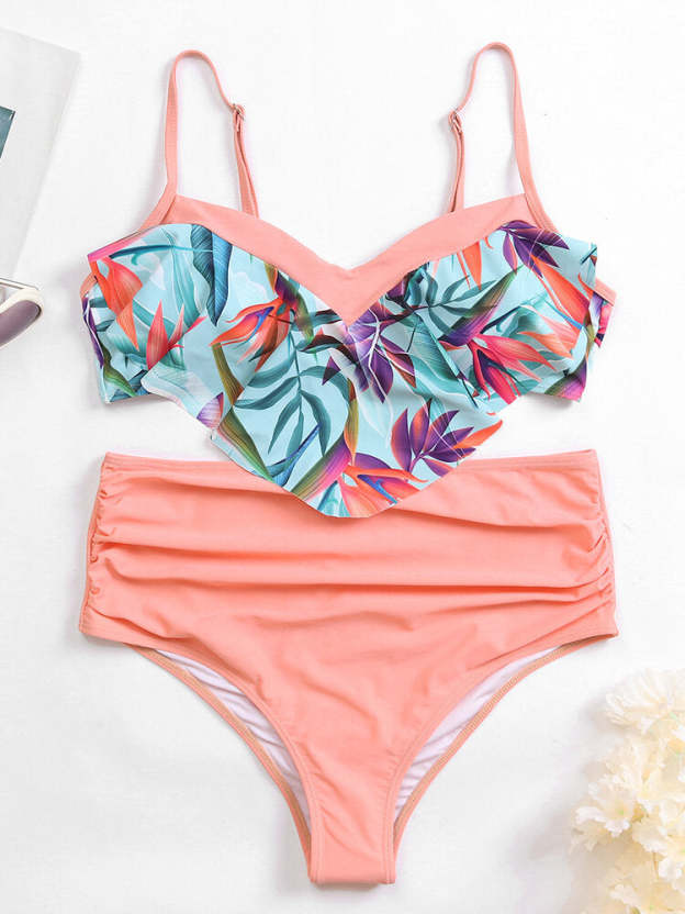 Tropical Print Ruffles Trim Open Back High Waist Holiday Irregular Beach Bikini