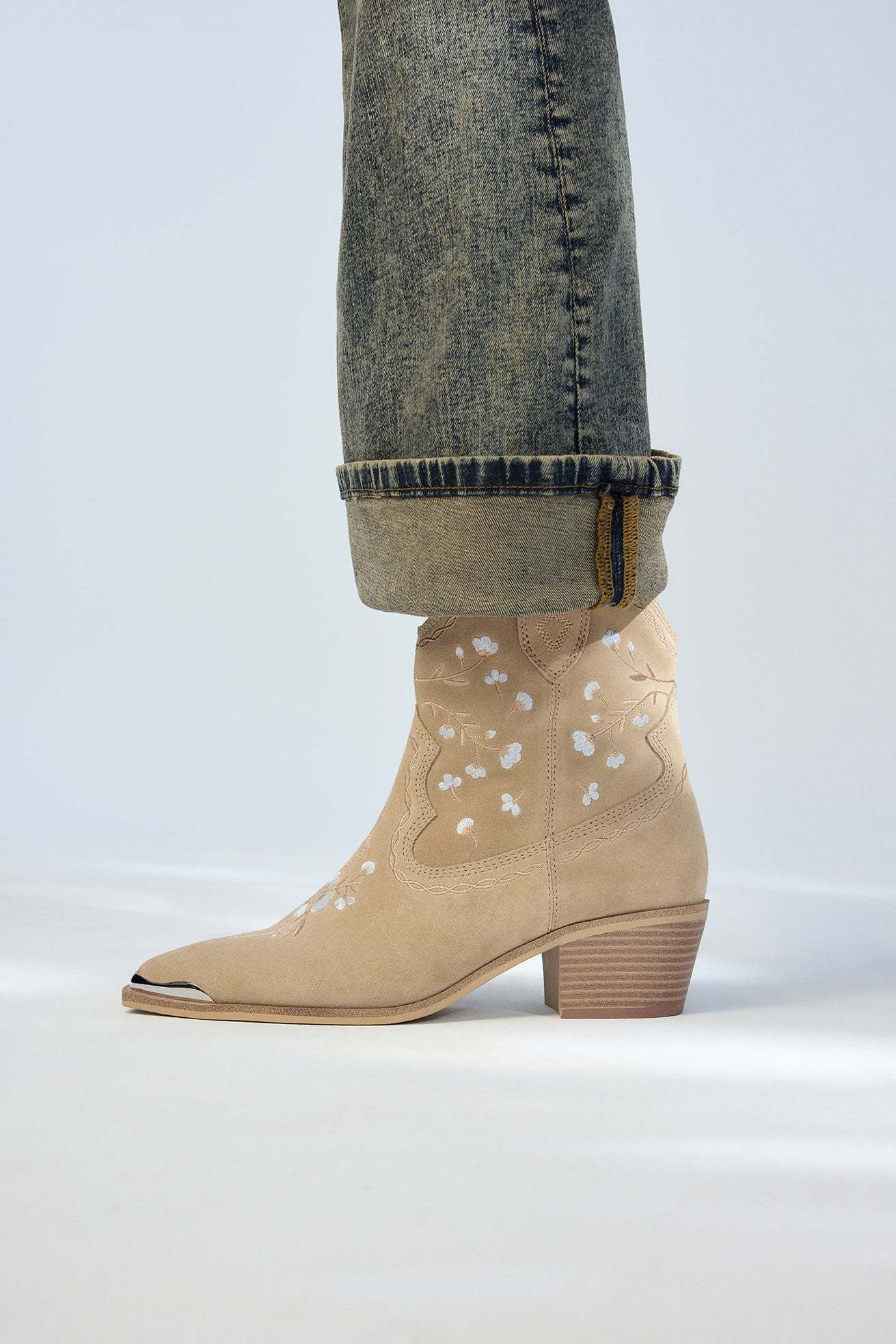 #Style notes * #Details *Silhouette: Ankle Boots *Toe Shape: Pointy *Heel Type: Block (Thick) *Closure Type: Slip Ons *Ornaments: Cap Toe *Comfort Features: Pillow Walk *Colour: Beige #Materials *Upper: 70% Cow Grain Leather, 30% Polyester *Main: Leather *Sole: Thermo Plastic Rubber #Measurements *Heel Height: 2.00 In (5.08 Cm) *Shaft Height: 6.00 In (15.24 Cm) *Calf Circumference: 12.00 In (30.48 Cm)