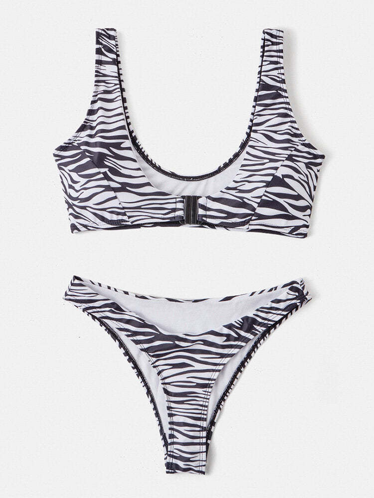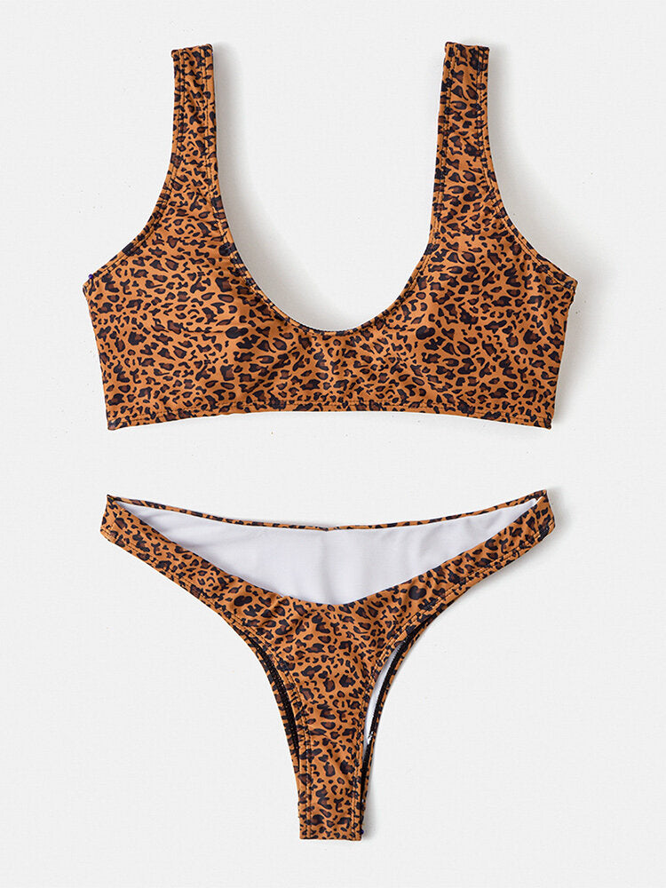 Women Leopard Animal Print Wide Shoulder Straps Backless Bikini Thong Swimsuits