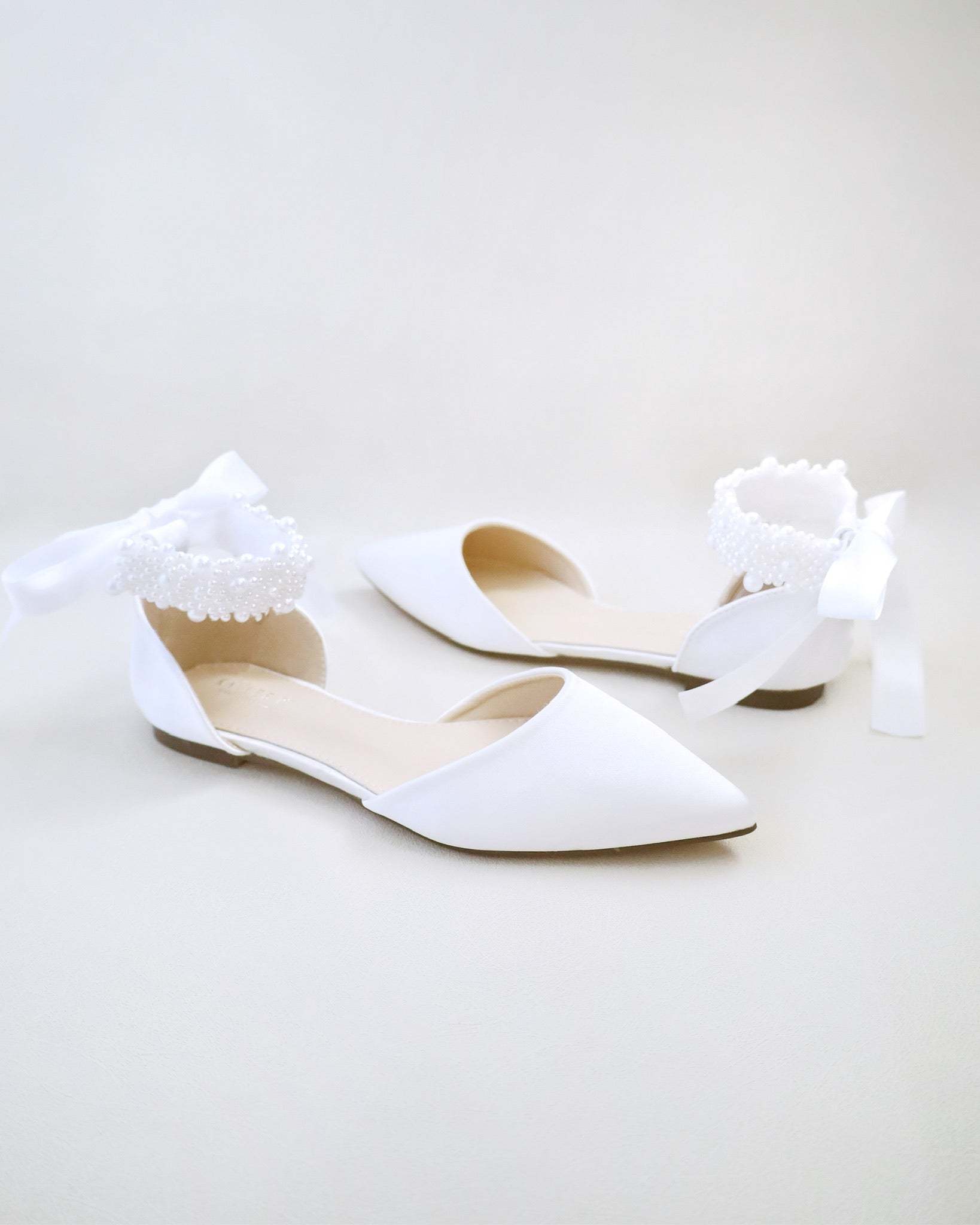 Satin Pointy Toe Wedding Flats with Perla Ankle Strap