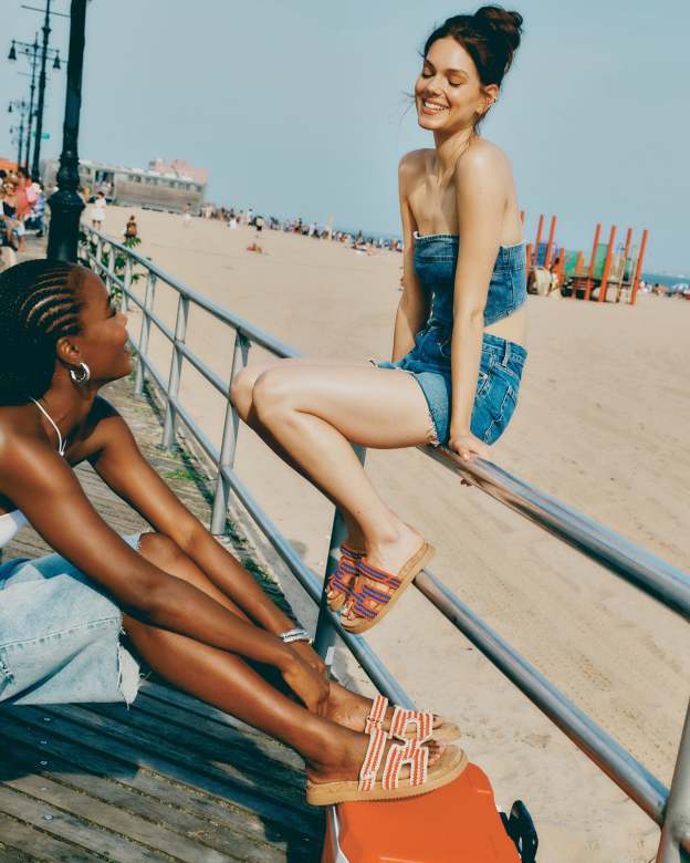 The MAYVEN slides feature comfy construction details like a molded footbed, a treaded flatform sole, and an adjustable top strap, plus a front strap with a geometric cutout design.